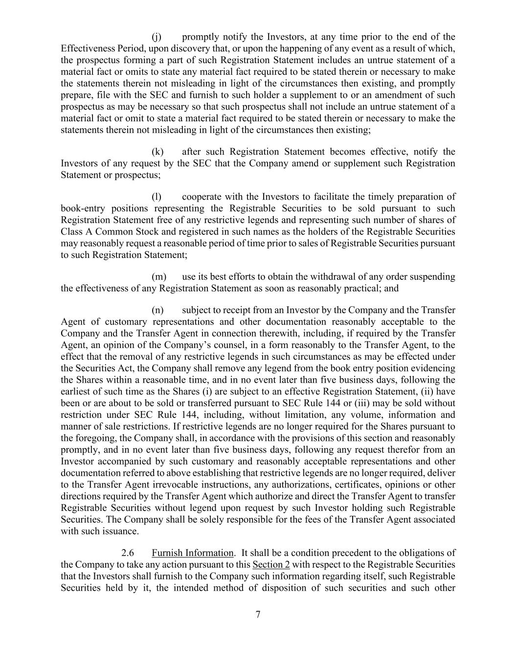 7 (j) promptly notify the Investors, at any time prior to the end of the Effectiveness Period, upon discovery that, or upon the happening of any event as a result of which, the prospectus forming a part of such Registration Statement includes an untrue statement of a material fact or omits to state any material fact required to be stated therein or necessary to make the statements therein not misleading in light of the circumstances then existing, and promptly prepare, file with the SEC and furnish to such holder a supplement to or an amendment of such prospectus as may be necessary so that such prospectus shall not include an untrue statement of a material fact or omit to state a material fact required to be stated therein or necessary to make the statements therein not misleading in light of the circumstances then existing; (k) after such Registration Statement becomes effective, notify the Investors of any request by the SEC that the Company amend or supplement such Registration Statement or prospectus; (l) cooperate with the Investors to facilitate the timely preparation of book-entry positions representing the Registrable Securities to be sold pursuant to such Registration Statement free of any restrictive legends and representing such number of shares of Class A Common Stock and registered in such names as the holders of the Registrable Securities may reasonably request a reasonable period of time prior to sales of Registrable Securities pursuant to such Registration Statement; (m) use its best efforts to obtain the withdrawal of any order suspending the effectiveness of any Registration Statement as soon as reasonably practical; and (n) subject to receipt from an Investor by the Company and the Transfer Agent of customary representations and other documentation reasonably acceptable to the Company and the Transfer Agent in connection therewith, including, if required by the Transfer Agent, an opinion of the Company’s counsel, in a form reasonably to the Transfer Agent, to the effect that the removal of any restrictive legends in such circumstances as may be effected under the Securities Act, the Company shall remove any legend from the book entry position evidencing the Shares within a reasonable time, and in no event later than five business days, following the earliest of such time as the Shares (i) are subject to an effective Registration Statement, (ii) have been or are about to be sold or transferred pursuant to SEC Rule 144 or (iii) may be sold without restriction under SEC Rule 144, including, without limitation, any volume, information and manner of sale restrictions. If restrictive legends are no longer required for the Shares pursuant to the foregoing, the Company shall, in accordance with the provisions of this section and reasonably promptly, and in no event later than five business days, following any request therefor from an Investor accompanied by such customary and reasonably acceptable representations and other documentation referred to above establishing that restrictive legends are no longer required, deliver to the Transfer Agent irrevocable instructions, any authorizations, certificates, opinions or other directions required by the Transfer Agent which authorize and direct the Transfer Agent to transfer Registrable Securities without legend upon request by such Investor holding such Registrable Securities. The Company shall be solely responsible for the fees of the Transfer Agent associated with such issuance. 2.6 Furnish Information. It shall be a condition precedent to the obligations of the Company to take any action pursuant to this Section 2 with respect to the Registrable Securities that the Investors shall furnish to the Company such information regarding itself, such Registrable Securities held by it, the intended method of disposition of such securities and such other