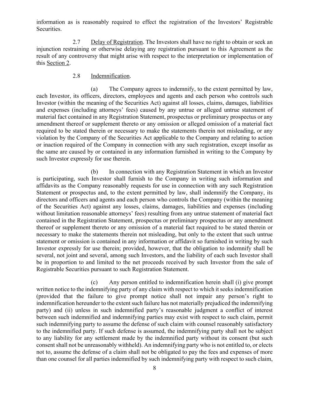 8 information as is reasonably required to effect the registration of the Investors’ Registrable Securities. 2.7 Delay of Registration. The Investors shall have no right to obtain or seek an injunction restraining or otherwise delaying any registration pursuant to this Agreement as the result of any controversy that might arise with respect to the interpretation or implementation of this Section 2. 2.8 Indemnification. (a) The Company agrees to indemnify, to the extent permitted by law, each Investor, its officers, directors, employees and agents and each person who controls such Investor (within the meaning of the Securities Act) against all losses, claims, damages, liabilities and expenses (including attorneys’ fees) caused by any untrue or alleged untrue statement of material fact contained in any Registration Statement, prospectus or preliminary prospectus or any amendment thereof or supplement thereto or any omission or alleged omission of a material fact required to be stated therein or necessary to make the statements therein not misleading, or any violation by the Company of the Securities Act applicable to the Company and relating to action or inaction required of the Company in connection with any such registration, except insofar as the same are caused by or contained in any information furnished in writing to the Company by such Investor expressly for use therein. (b) In connection with any Registration Statement in which an Investor is participating, such Investor shall furnish to the Company in writing such information and affidavits as the Company reasonably requests for use in connection with any such Registration Statement or prospectus and, to the extent permitted by law, shall indemnify the Company, its directors and officers and agents and each person who controls the Company (within the meaning of the Securities Act) against any losses, claims, damages, liabilities and expenses (including without limitation reasonable attorneys’ fees) resulting from any untrue statement of material fact contained in the Registration Statement, prospectus or preliminary prospectus or any amendment thereof or supplement thereto or any omission of a material fact required to be stated therein or necessary to make the statements therein not misleading, but only to the extent that such untrue statement or omission is contained in any information or affidavit so furnished in writing by such Investor expressly for use therein; provided, however, that the obligation to indemnify shall be several, not joint and several, among such Investors, and the liability of each such Investor shall be in proportion to and limited to the net proceeds received by such Investor from the sale of Registrable Securities pursuant to such Registration Statement. (c) Any person entitled to indemnification herein shall (i) give prompt written notice to the indemnifying party of any claim with respect to which it seeks indemnification (provided that the failure to give prompt notice shall not impair any person’s right to indemnification hereunder to the extent such failure has not materially prejudiced the indemnifying party) and (ii) unless in such indemnified party’s reasonable judgment a conflict of interest between such indemnified and indemnifying parties may exist with respect to such claim, permit such indemnifying party to assume the defense of such claim with counsel reasonably satisfactory to the indemnified party. If such defense is assumed, the indemnifying party shall not be subject to any liability for any settlement made by the indemnified party without its consent (but such consent shall not be unreasonably withheld). An indemnifying party who is not entitled to, or elects not to, assume the defense of a claim shall not be obligated to pay the fees and expenses of more than one counsel for all parties indemnified by such indemnifying party with respect to such claim,
