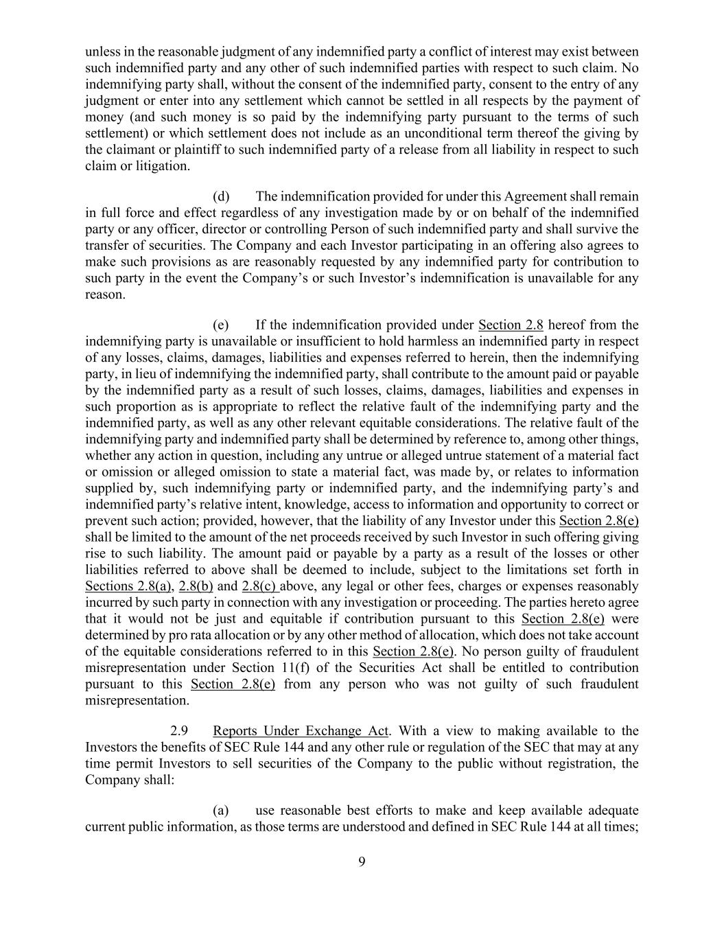9 unless in the reasonable judgment of any indemnified party a conflict of interest may exist between such indemnified party and any other of such indemnified parties with respect to such claim. No indemnifying party shall, without the consent of the indemnified party, consent to the entry of any judgment or enter into any settlement which cannot be settled in all respects by the payment of money (and such money is so paid by the indemnifying party pursuant to the terms of such settlement) or which settlement does not include as an unconditional term thereof the giving by the claimant or plaintiff to such indemnified party of a release from all liability in respect to such claim or litigation. (d) The indemnification provided for under this Agreement shall remain in full force and effect regardless of any investigation made by or on behalf of the indemnified party or any officer, director or controlling Person of such indemnified party and shall survive the transfer of securities. The Company and each Investor participating in an offering also agrees to make such provisions as are reasonably requested by any indemnified party for contribution to such party in the event the Company’s or such Investor’s indemnification is unavailable for any reason. (e) If the indemnification provided under Section 2.8 hereof from the indemnifying party is unavailable or insufficient to hold harmless an indemnified party in respect of any losses, claims, damages, liabilities and expenses referred to herein, then the indemnifying party, in lieu of indemnifying the indemnified party, shall contribute to the amount paid or payable by the indemnified party as a result of such losses, claims, damages, liabilities and expenses in such proportion as is appropriate to reflect the relative fault of the indemnifying party and the indemnified party, as well as any other relevant equitable considerations. The relative fault of the indemnifying party and indemnified party shall be determined by reference to, among other things, whether any action in question, including any untrue or alleged untrue statement of a material fact or omission or alleged omission to state a material fact, was made by, or relates to information supplied by, such indemnifying party or indemnified party, and the indemnifying party’s and indemnified party’s relative intent, knowledge, access to information and opportunity to correct or prevent such action; provided, however, that the liability of any Investor under this Section 2.8(e) shall be limited to the amount of the net proceeds received by such Investor in such offering giving rise to such liability. The amount paid or payable by a party as a result of the losses or other liabilities referred to above shall be deemed to include, subject to the limitations set forth in Sections 2.8(a), 2.8(b) and 2.8(c) above, any legal or other fees, charges or expenses reasonably incurred by such party in connection with any investigation or proceeding. The parties hereto agree that it would not be just and equitable if contribution pursuant to this Section 2.8(e) were determined by pro rata allocation or by any other method of allocation, which does not take account of the equitable considerations referred to in this Section 2.8(e). No person guilty of fraudulent misrepresentation under Section 11(f) of the Securities Act shall be entitled to contribution pursuant to this Section 2.8(e) from any person who was not guilty of such fraudulent misrepresentation. 2.9 Reports Under Exchange Act. With a view to making available to the Investors the benefits of SEC Rule 144 and any other rule or regulation of the SEC that may at any time permit Investors to sell securities of the Company to the public without registration, the Company shall: (a) use reasonable best efforts to make and keep available adequate current public information, as those terms are understood and defined in SEC Rule 144 at all times;