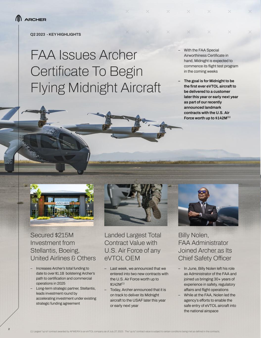 FAA Issues Archer Certificate To Begin Flying Midnight Aircraft 2 Billy Nolen, FAA Administrator Joined Archer as Its Chief Safety Officer – In June, Billy Nolen left his role as Administrator of the FAA and joined us bringing 30+ years of experience in safety, regulatory affairs and flight operations – While at the FAA, Nolen led the agency’s efforts to enable the safe entry of eVTOL aircraft into the national airspace Secured $215M Investment from Stellantis, Boeing, United Airlines & Others – Increases Archer’s total funding to date to over $1.1B bolstering Archer’s path to certification and commercial operations in 2025 – Long-term strategic partner, Stellantis, leads investment round by accelerating investment under existing strategic funding agreement Q2 2023 - KEY HIGHLIGHTS – With the FAA Special Airworthiness Certificate in hand, Midnight is expected to commence its flight test program in the coming weeks – The goal is for Midnight to be the first ever eVTOL aircraft to be delivered to a customer later this year or early next year as part of our recently announced landmark contracts with the U.S. Air Force worth up to $142M(1) Landed Largest Total Contract Value with U.S. Air Force of any eVTOL OEM – Last week, we announced that we entered into two new contracts with the U.S. Air Force worth up to $142M(1) – Today, Archer announced that it is on track to deliver its Midnight aircraft to the USAF later this year or early next year (1) Largest "up to" contract awarded by AFWERX to an eVTOL company as of July 27, 2023. The “up to” contract value is subject to certain conditions being met as defined in the contracts.