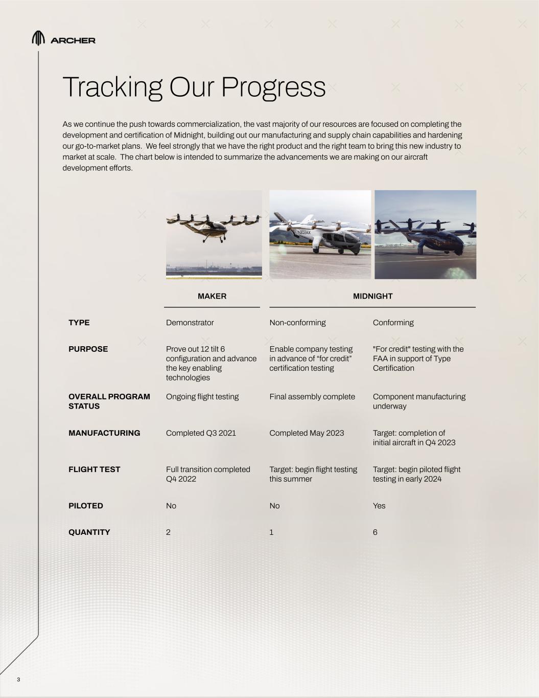 3 Tracking Our Progress As we continue the push towards commercialization, the vast majority of our resources are focused on completing the development and certification of Midnight, building out our manufacturing and supply chain capabilities and hardening our go-to-market plans. We feel strongly that we have the right product and the right team to bring this new industry to market at scale. The chart below is intended to summarize the advancements we are making on our aircraft development efforts. MAKER MIDNIGHT TYPE Demonstrator Non-conforming Conforming PURPOSE Prove out 12 tilt 6 configuration and advance the key enabling technologies Enable company testing in advance of “for credit” certification testing "For credit" testing with the FAA in support of Type Certification OVERALL PROGRAM STATUS Ongoing flight testing Final assembly complete Component manufacturing underway MANUFACTURING Completed Q3 2021 Completed May 2023 Target: completion of initial aircraft in Q4 2023 FLIGHT TEST Full transition completed Q4 2022 Target: begin flight testing this summer Target: begin piloted flight testing in early 2024 PILOTED No No Yes QUANTITY 2 1 6