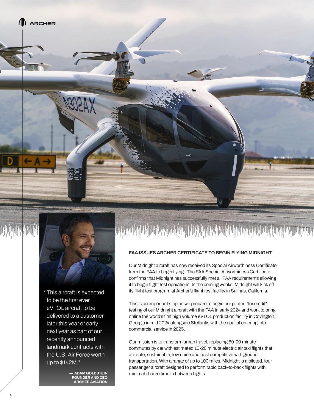 “ This aircraft is expected to be the first ever eVTOL aircraft to be delivered to a customer later this year or early next year as part of our recently announced landmark contracts with the U.S. Air Force worth up to $142M.” — ADAM GOLDSTEIN FOUNDER AND CEO ARCHER AVIATION 4 FAA ISSUES ARCHER CERTIFICATE TO BEGIN FLYING MIDNIGHT Our Midnight aircraft has now received its Special Airworthiness Certificate from the FAA to begin flying. The FAA Special Airworthiness Certificate confirms that Midnight has successfully met all FAA requirements allowing it to begin flight test operations. In the coming weeks, Midnight will kick off its flight test program at Archer’s flight test facility in Salinas, California. This is an important step as we prepare to begin our piloted "for credit" testing of our Midnight aircraft with the FAA in early 2024 and work to bring online the world’s first high volume eVTOL production facility in Covington, Georgia in mid 2024 alongside Stellantis with the goal of entering into commercial service in 2025. Our mission is to transform urban travel, replacing 60-90 minute commutes by car with estimated 10-20 minute electric air taxi flights that are safe, sustainable, low noise and cost competitive with ground transportation. With a range of up to 100 miles, Midnight is a piloted, four passenger aircraft designed to perform rapid back-to-back flights with minimal charge time in between flights.