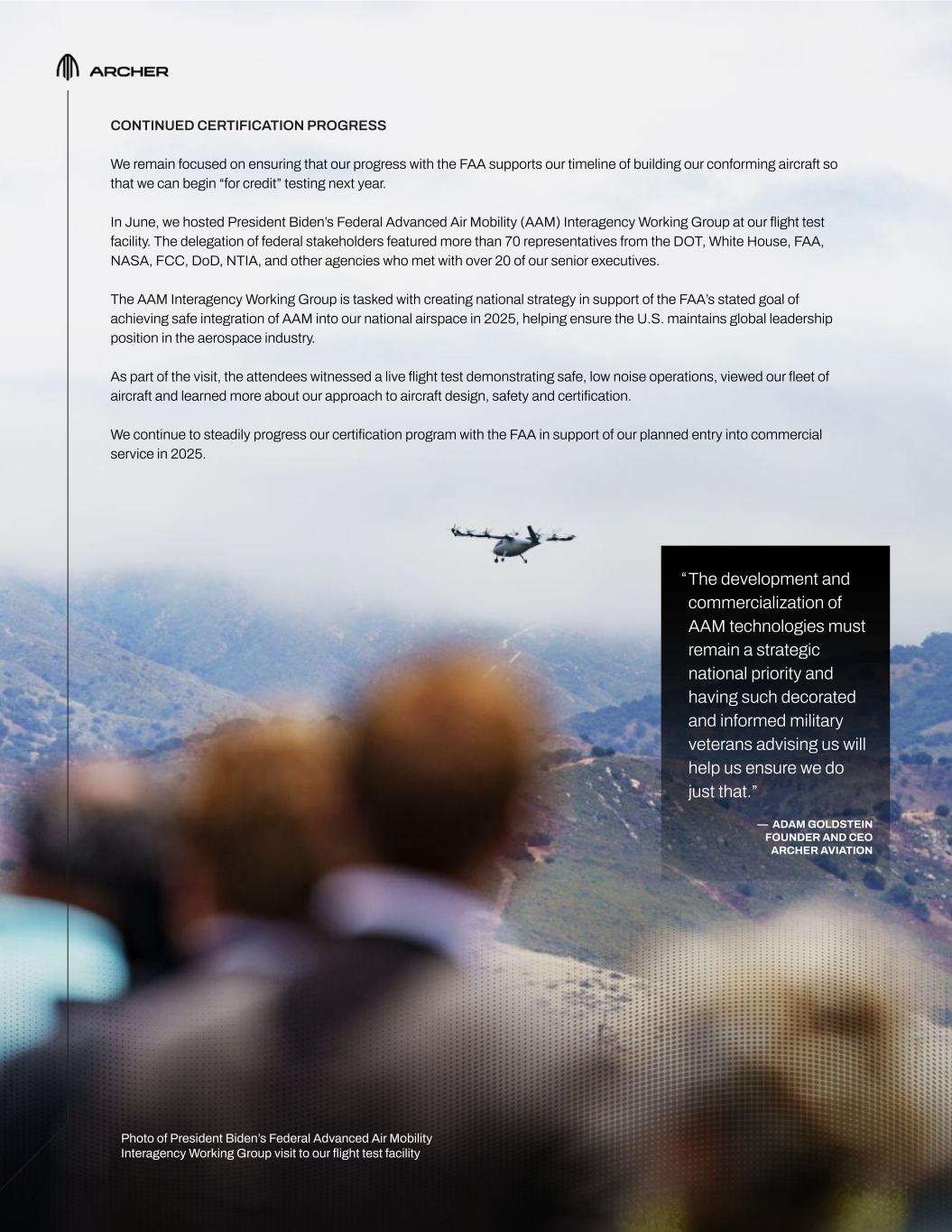 7 CONTINUED CERTIFICATION PROGRESS We remain focused on ensuring that our progress with the FAA supports our timeline of building our conforming aircraft so that we can begin “for credit” testing next year. In June, we hosted President Biden’s Federal Advanced Air Mobility (AAM) Interagency Working Group at our flight test facility. The delegation of federal stakeholders featured more than 70 representatives from the DOT, White House, FAA, NASA, FCC, DoD, NTIA, and other agencies who met with over 20 of our senior executives. The AAM Interagency Working Group is tasked with creating national strategy in support of the FAA’s stated goal of achieving safe integration of AAM into our national airspace in 2025, helping ensure the U.S. maintains global leadership position in the aerospace industry. As part of the visit, the attendees witnessed a live flight test demonstrating safe, low noise operations, viewed our fleet of aircraft and learned more about our approach to aircraft design, safety and certification. We continue to steadily progress our certification program with the FAA in support of our planned entry into commercial service in 2025. The development and commercialization of AAM technologies must remain a strategic national priority and having such decorated and informed military veterans advising us will help us ensure we do just that.” — ADAM GOLDSTEIN FOUNDER AND CEO ARCHER AVIATION “ Photo of President Biden’s Federal Advanced Air Mobility Interagency Working Group visit to our flight test facility