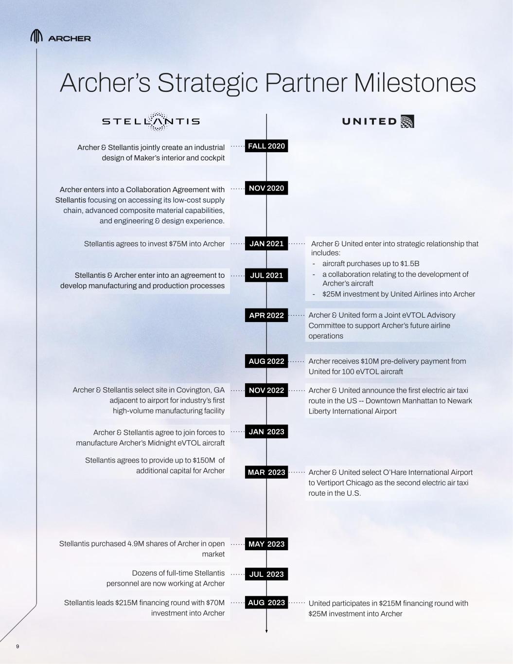 9 Archer’s Strategic Partner Milestones Archer & United form a Joint eVTOL Advisory Committee to support Archer’s future airline operations Archer & United enter into strategic relationship that includes: - aircraft purchases up to $1.5B - a collaboration relating to the development of Archer’s aircraft - $25M investment by United Airlines into Archer Archer receives $10M pre-delivery payment from United for 100 eVTOL aircraft Archer & United announce the first electric air taxi route in the US -- Downtown Manhattan to Newark Liberty International Airport Archer & United select O’Hare International Airport to Vertiport Chicago as the second electric air taxi route in the U.S. Stellantis purchased 4.9M shares of Archer in open market Archer & Stellantis agree to join forces to manufacture Archer’s Midnight eVTOL aircraft Stellantis agrees to provide up to $150M of additional capital for Archer Archer & Stellantis select site in Covington, GA adjacent to airport for industry’s first high-volume manufacturing facility Stellantis agrees to invest $75M into Archer Stellantis & Archer enter into an agreement to develop manufacturing and production processes Archer enters into a Collaboration Agreement with Stellantis focusing on accessing its low-cost supply chain, advanced composite material capabilities, and engineering & design experience. Archer & Stellantis jointly create an industrial design of Maker’s interior and cockpit NOV 2020 JAN 2021 JUL 2021 AUG 2022 JAN 2023 FALL 2020 MAY 2023 JUL 2023 APR 2022 MAR 2023 NOV 2022 Dozens of full-time Stellantis personnel are now working at Archer AUG 2023Stellantis leads $215M financing round with $70M investment into Archer United participates in $215M financing round with $25M investment into Archer