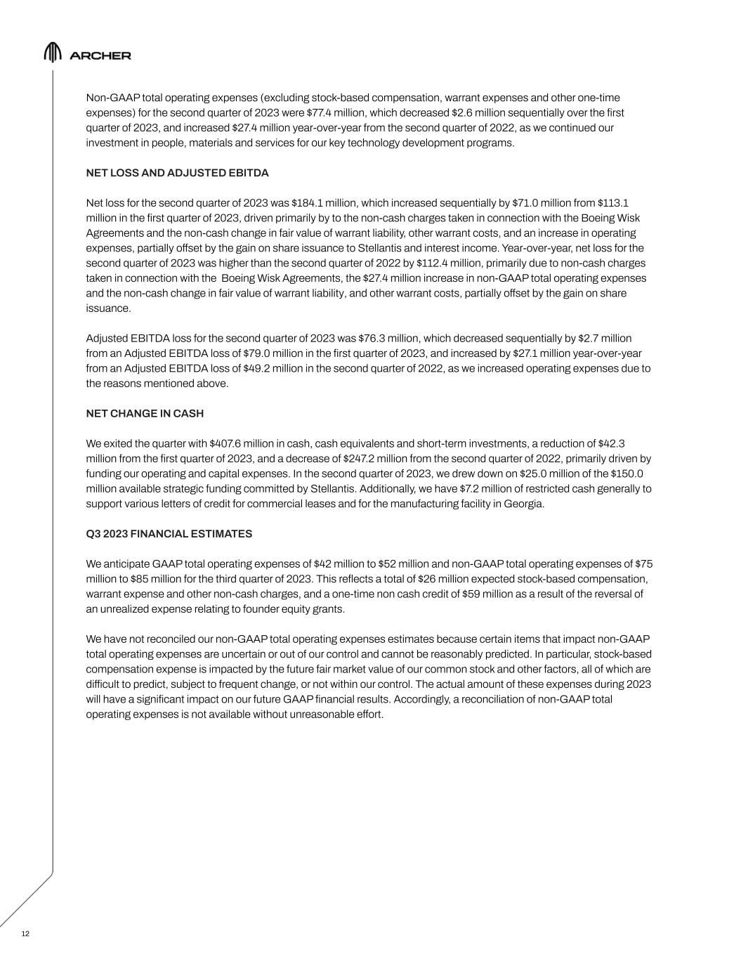 12 Non-GAAP total operating expenses (excluding stock-based compensation, warrant expenses and other one-time expenses) for the second quarter of 2023 were $77.4 million, which decreased $2.6 million sequentially over the first quarter of 2023, and increased $27.4 million year-over-year from the second quarter of 2022, as we continued our investment in people, materials and services for our key technology development programs. NET LOSS AND ADJUSTED EBITDA Net loss for the second quarter of 2023 was $184.1 million, which increased sequentially by $71.0 million from $113.1 million in the first quarter of 2023, driven primarily by to the non-cash charges taken in connection with the Boeing Wisk Agreements and the non-cash change in fair value of warrant liability, other warrant costs, and an increase in operating expenses, partially offset by the gain on share issuance to Stellantis and interest income. Year-over-year, net loss for the second quarter of 2023 was higher than the second quarter of 2022 by $112.4 million, primarily due to non-cash charges taken in connection with the Boeing Wisk Agreements, the $27.4 million increase in non-GAAP total operating expenses and the non-cash change in fair value of warrant liability, and other warrant costs, partially offset by the gain on share issuance. Adjusted EBITDA loss for the second quarter of 2023 was $76.3 million, which decreased sequentially by $2.7 million from an Adjusted EBITDA loss of $79.0 million in the first quarter of 2023, and increased by $27.1 million year-over-year from an Adjusted EBITDA loss of $49.2 million in the second quarter of 2022, as we increased operating expenses due to the reasons mentioned above. NET CHANGE IN CASH We exited the quarter with $407.6 million in cash, cash equivalents and short-term investments, a reduction of $42.3 million from the first quarter of 2023, and a decrease of $247.2 million from the second quarter of 2022, primarily driven by funding our operating and capital expenses. In the second quarter of 2023, we drew down on $25.0 million of the $150.0 million available strategic funding committed by Stellantis. Additionally, we have $7.2 million of restricted cash generally to support various letters of credit for commercial leases and for the manufacturing facility in Georgia. Q3 2023 FINANCIAL ESTIMATES We anticipate GAAP total operating expenses of $42 million to $52 million and non-GAAP total operating expenses of $75 million to $85 million for the third quarter of 2023. This reflects a total of $26 million expected stock-based compensation, warrant expense and other non-cash charges, and a one-time non cash credit of $59 million as a result of the reversal of an unrealized expense relating to founder equity grants. We have not reconciled our non-GAAP total operating expenses estimates because certain items that impact non-GAAP total operating expenses are uncertain or out of our control and cannot be reasonably predicted. In particular, stock-based compensation expense is impacted by the future fair market value of our common stock and other factors, all of which are difficult to predict, subject to frequent change, or not within our control. The actual amount of these expenses during 2023 will have a significant impact on our future GAAP financial results. Accordingly, a reconciliation of non-GAAP total operating expenses is not available without unreasonable effort.
