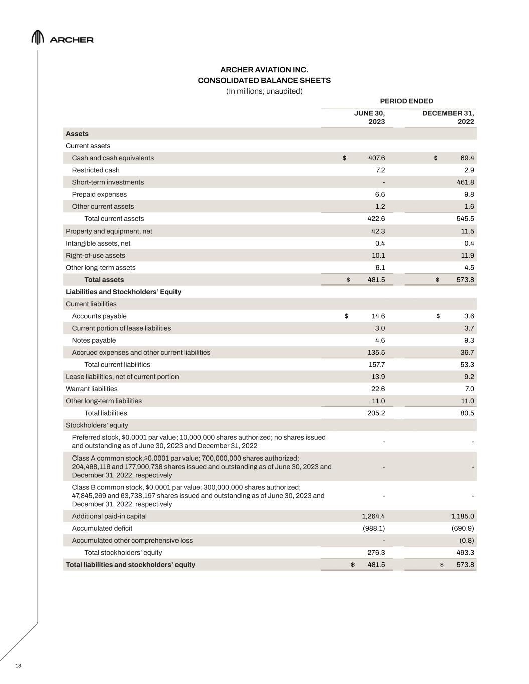 ARCHER AVIATION INC. CONSOLIDATED BALANCE SHEETS (In millions; unaudited) 13 PERIOD ENDED JUNE 30, 2023 DECEMBER 31, 2022 Assets Current assets Cash and cash equivalents $ 407.6 $ 69.4 Restricted cash 7.2 2.9 Short-term investments - 461.8 Prepaid expenses 6.6 9.8 Other current assets 1.2 1.6 Total current assets 422.6 545.5 Property and equipment, net 42.3 11.5 Intangible assets, net 0.4 0.4 Right-of-use assets 10.1 11.9 Other long-term assets 6.1 4.5 Total assets $ 481.5 $ 573.8 Liabilities and Stockholders’ Equity Current liabilities Accounts payable $ 14.6 $ 3.6 Current portion of lease liabilities 3.0 3.7 Notes payable 4.6 9.3 Accrued expenses and other current liabilities 135.5 36.7 Total current liabilities 157.7 53.3 Lease liabilities, net of current portion 13.9 9.2 Warrant liabilities 22.6 7.0 Other long-term liabilities 11.0 11.0 Total liabilities 205.2 80.5 Stockholders’ equity Preferred stock, $0.0001 par value; 10,000,000 shares authorized; no shares issued and outstanding as of June 30, 2023 and December 31, 2022 - - Class A common stock,$0.0001 par value; 700,000,000 shares authorized; 204,468,116 and 177,900,738 shares issued and outstanding as of June 30, 2023 and December 31, 2022, respectively - - Class B common stock, $0.0001 par value; 300,000,000 shares authorized; 47,845,269 and 63,738,197 shares issued and outstanding as of June 30, 2023 and December 31, 2022, respectively - - Additional paid-in capital 1,264.4 1,185.0 Accumulated deficit (988.1) (690.9) Accumulated other comprehensive loss - (0.8) Total stockholders’ equity 276.3 493.3 Total liabilities and stockholders’ equity $ 481.5 $ 573.8
