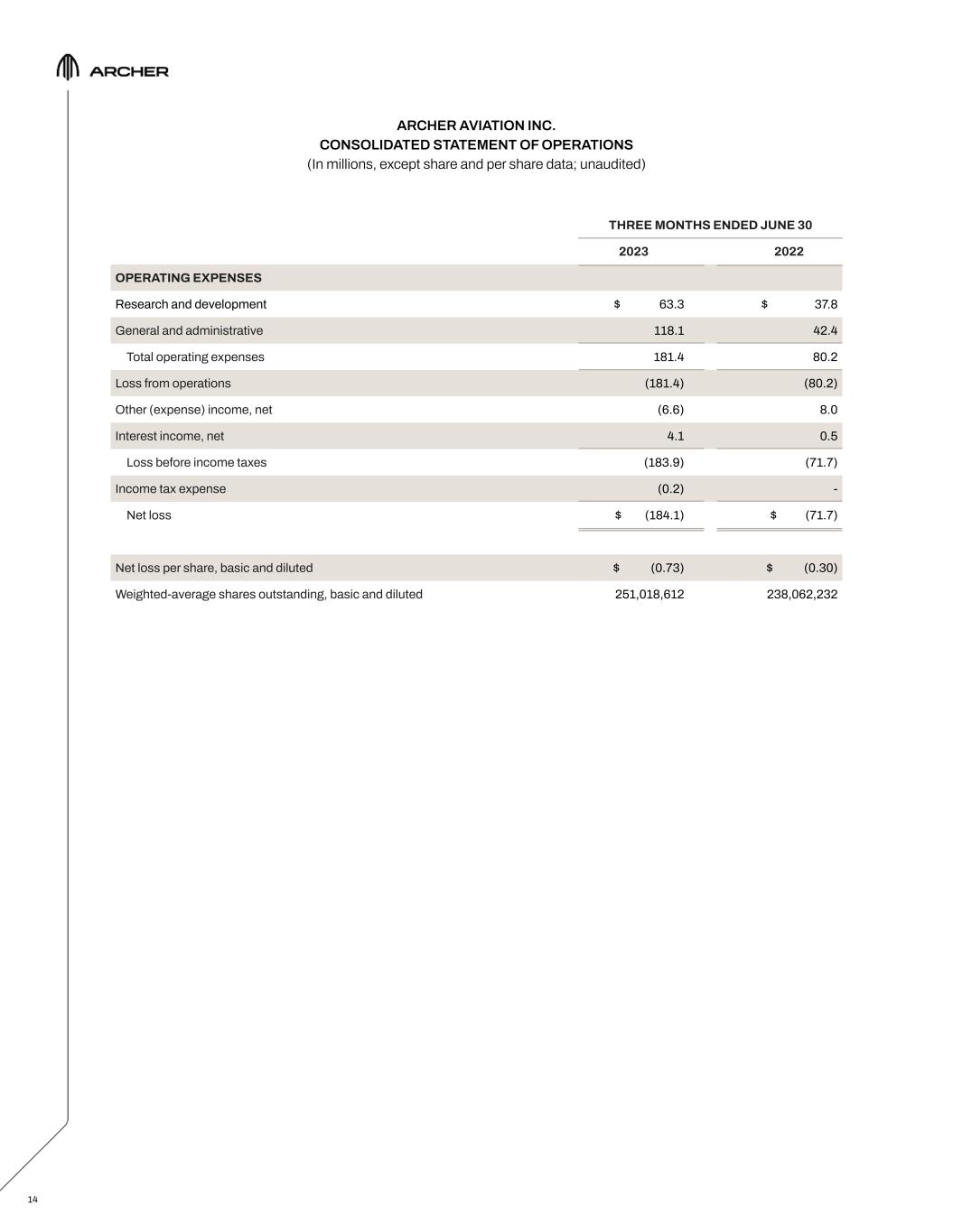 ARCHER AVIATION INC. CONSOLIDATED STATEMENT OF OPERATIONS (In millions, except share and per share data; unaudited) 14 THREE MONTHS ENDED JUNE 30 2023 2022 OPERATING EXPENSES Research and development $ 63.3 $ 37.8 General and administrative 118.1 42.4 Total operating expenses 181.4 80.2 Loss from operations (181.4) (80.2) Other (expense) income, net (6.6) 8.0 Interest income, net 4.1 0.5 Loss before income taxes (183.9) (71.7) Income tax expense (0.2) - Net loss $ (184.1) $ (71.7) Net loss per share, basic and diluted $ (0.73) $ (0.30) Weighted-average shares outstanding, basic and diluted 251,018,612 238,062,232