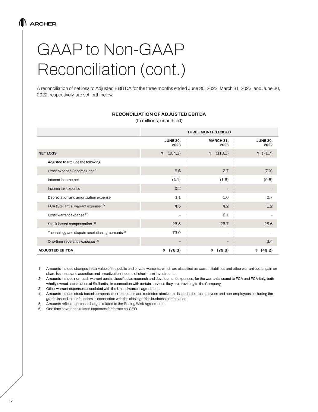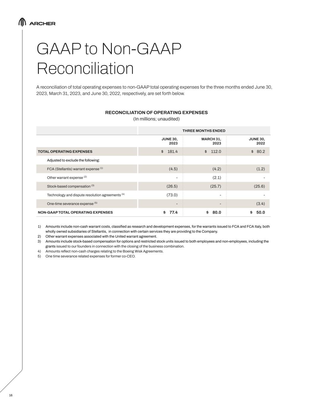 GAAP to Non-GAAP Reconciliation A reconciliation of total operating expenses to non-GAAP total operating expenses for the three months ended June 30, 2023, March 31, 2023, and June 30, 2022, respectively, are set forth below. RECONCILIATION OF OPERATING EXPENSES (In millions; unaudited) 1) Amounts include non-cash warrant costs, classified as research and development expenses, for the warrants issued to FCA and FCA Italy, both wholly owned subsidiaries of Stellantis, in connection with certain services they are providing to the Company. 2) Other warrant expenses associated with the United warrant agreement. 3) Amounts include stock-based compensation for options and restricted stock units issued to both employees and non-employees, including the grants issued to our founders in connection with the closing of the business combination. 4) Amounts reflect non-cash charges relating to the Boeing Wisk Agreements. 5) One time severance related expenses for former co-CEO. 16 THREE MONTHS ENDED JUNE 30, 2023 MARCH 31, 2023 JUNE 30, 2022 TOTAL OPERATING EXPENSES $ 181.4 $ 112.0 $ 80.2 Adjusted to exclude the following: FCA (Stellantis) warrant expense (1) (4.5) (4.2) (1.2) Other warrant expense (2) - (2.1) - Stock-based compensation (3) (26.5) (25.7) (25.6) Technology and dispute resolution agreements (4) (73.0) - - One-time severance expense (5) - - (3.4) NON-GAAP TOTAL OPERATING EXPENSES $ 77.4 $ 80.0 $ 50.0