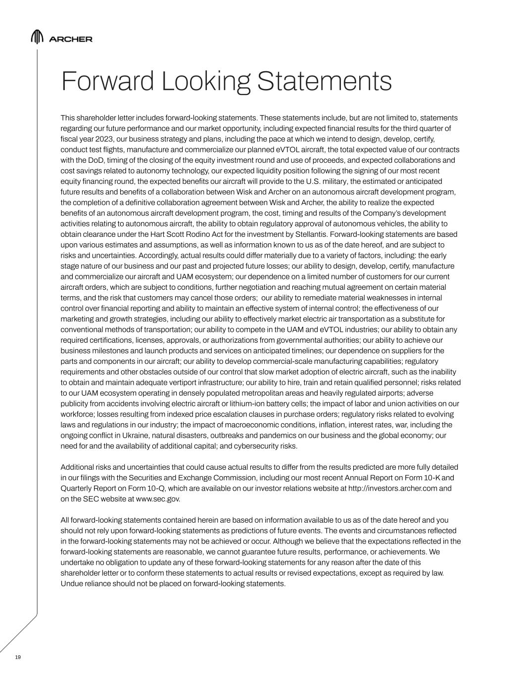 19 Forward Looking Statements This shareholder letter includes forward-looking statements. These statements include, but are not limited to, statements regarding our future performance and our market opportunity, including expected financial results for the third quarter of fiscal year 2023, our business strategy and plans, including the pace at which we intend to design, develop, certify, conduct test flights, manufacture and commercialize our planned eVTOL aircraft, the total expected value of our contracts with the DoD, timing of the closing of the equity investment round and use of proceeds, and expected collaborations and cost savings related to autonomy technology, our expected liquidity position following the signing of our most recent equity financing round, the expected benefits our aircraft will provide to the U.S. military, the estimated or anticipated future results and benefits of a collaboration between Wisk and Archer on an autonomous aircraft development program, the completion of a definitive collaboration agreement between Wisk and Archer, the ability to realize the expected benefits of an autonomous aircraft development program, the cost, timing and results of the Company’s development activities relating to autonomous aircraft, the ability to obtain regulatory approval of autonomous vehicles, the ability to obtain clearance under the Hart Scott Rodino Act for the investment by Stellantis. Forward-looking statements are based upon various estimates and assumptions, as well as information known to us as of the date hereof, and are subject to risks and uncertainties. Accordingly, actual results could differ materially due to a variety of factors, including: the early stage nature of our business and our past and projected future losses; our ability to design, develop, certify, manufacture and commercialize our aircraft and UAM ecosystem; our dependence on a limited number of customers for our current aircraft orders, which are subject to conditions, further negotiation and reaching mutual agreement on certain material terms, and the risk that customers may cancel those orders; our ability to remediate material weaknesses in internal control over financial reporting and ability to maintain an effective system of internal control; the effectiveness of our marketing and growth strategies, including our ability to effectively market electric air transportation as a substitute for conventional methods of transportation; our ability to compete in the UAM and eVTOL industries; our ability to obtain any required certifications, licenses, approvals, or authorizations from governmental authorities; our ability to achieve our business milestones and launch products and services on anticipated timelines; our dependence on suppliers for the parts and components in our aircraft; our ability to develop commercial-scale manufacturing capabilities; regulatory requirements and other obstacles outside of our control that slow market adoption of electric aircraft, such as the inability to obtain and maintain adequate vertiport infrastructure; our ability to hire, train and retain qualified personnel; risks related to our UAM ecosystem operating in densely populated metropolitan areas and heavily regulated airports; adverse publicity from accidents involving electric aircraft or lithium-ion battery cells; the impact of labor and union activities on our workforce; losses resulting from indexed price escalation clauses in purchase orders; regulatory risks related to evolving laws and regulations in our industry; the impact of macroeconomic conditions, inflation, interest rates, war, including the ongoing conflict in Ukraine, natural disasters, outbreaks and pandemics on our business and the global economy; our need for and the availability of additional capital; and cybersecurity risks. Additional risks and uncertainties that could cause actual results to differ from the results predicted are more fully detailed in our filings with the Securities and Exchange Commission, including our most recent Annual Report on Form 10-K and Quarterly Report on Form 10-Q, which are available on our investor relations website at http://investors.archer.com and on the SEC website at www.sec.gov. All forward-looking statements contained herein are based on information available to us as of the date hereof and you should not rely upon forward-looking statements as predictions of future events. The events and circumstances reflected in the forward-looking statements may not be achieved or occur. Although we believe that the expectations reflected in the forward-looking statements are reasonable, we cannot guarantee future results, performance, or achievements. We undertake no obligation to update any of these forward-looking statements for any reason after the date of this shareholder letter or to conform these statements to actual results or revised expectations, except as required by law. Undue reliance should not be placed on forward-looking statements.