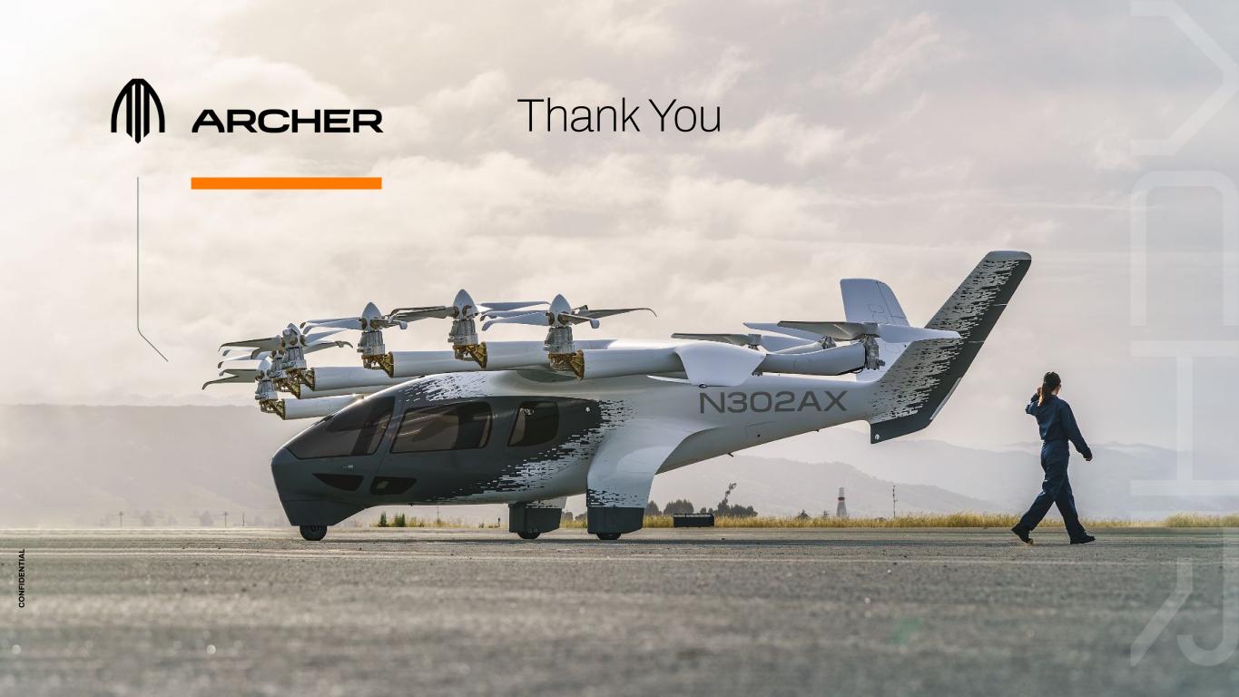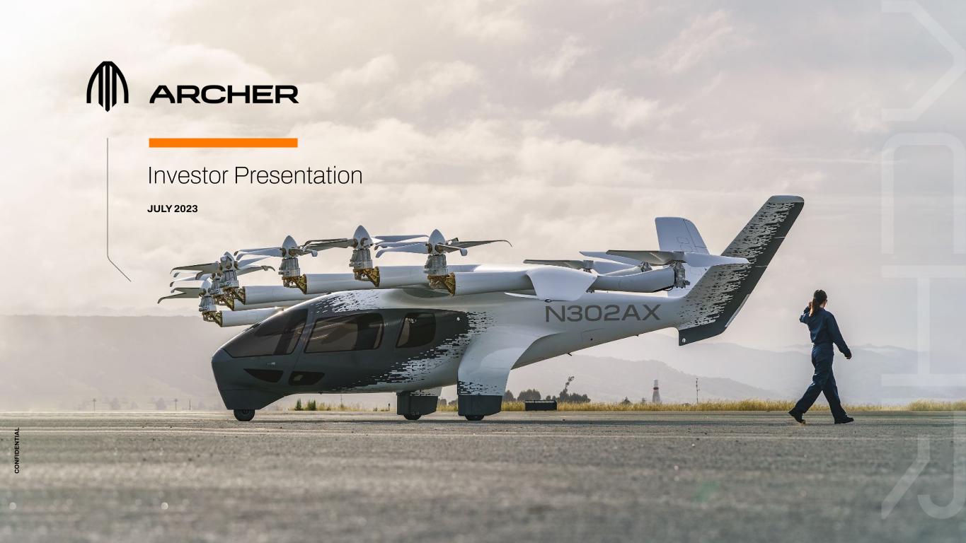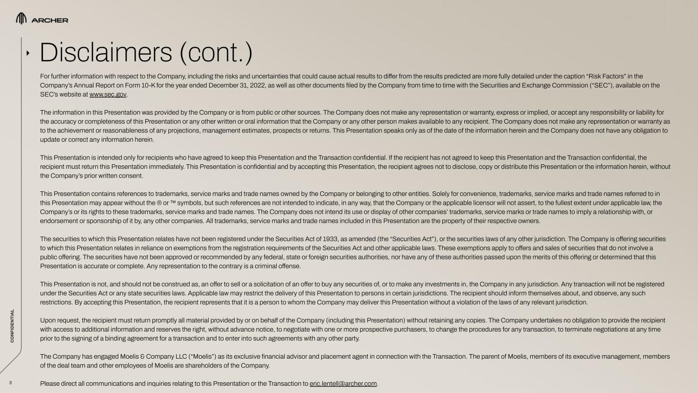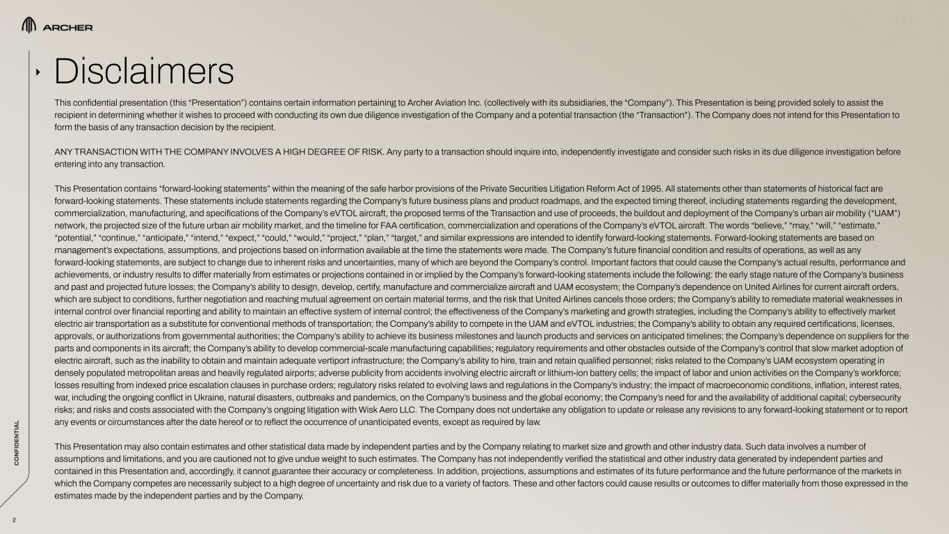C O N FI D EN TI A L C O N FI D EN TI A L 2 This confidential presentation (this “Presentation”) contains certain information pertaining to Archer Aviation Inc. (collectively with its subsidiaries, the “Company”). This Presentation is being provided solely to assist the recipient in determining whether it wishes to proceed with conducting its own due diligence investigation of the Company and a potential transaction (the “Transaction”). The Company does not intend for this Presentation to form the basis of any transaction decision by the recipient. ANY TRANSACTION WITH THE COMPANY INVOLVES A HIGH DEGREE OF RISK. Any party to a transaction should inquire into, independently investigate and consider such risks in its due diligence investigation before entering into any transaction. This Presentation contains “forward-looking statements” within the meaning of the safe harbor provisions of the Private Securities Litigation Reform Act of 1995. All statements other than statements of historical fact are forward-looking statements. These statements include statements regarding the Company’s future business plans and product roadmaps, and the expected timing thereof, including statements regarding the development, commercialization, manufacturing, and specifications of the Company’s eVTOL aircraft, the proposed terms of the Transaction and use of proceeds, the buildout and deployment of the Company’s urban air mobility (“UAM”) network, the projected size of the future urban air mobility market, and the timeline for FAA certification, commercialization and operations of the Company’s eVTOL aircraft. The words “believe,” “may,” “will,” “estimate,” “potential,” “continue,” “anticipate,” “intend,” “expect,” “could,” “would,” “project,” “plan,” “target,” and similar expressions are intended to identify forward-looking statements. Forward-looking statements are based on management’s expectations, assumptions, and projections based on information available at the time the statements were made. The Company’s future financial condition and results of operations, as well as any forward-looking statements, are subject to change due to inherent risks and uncertainties, many of which are beyond the Company’s control. Important factors that could cause the Company’s actual results, performance and achievements, or industry results to differ materially from estimates or projections contained in or implied by the Company’s forward-looking statements include the following: the early stage nature of the Company’s business and past and projected future losses; the Company’s ability to design, develop, certify, manufacture and commercialize aircraft and UAM ecosystem; the Company’s dependence on United Airlines for current aircraft orders, which are subject to conditions, further negotiation and reaching mutual agreement on certain material terms, and the risk that United Airlines cancels those orders; the Company’s ability to remediate material weaknesses in internal control over financial reporting and ability to maintain an effective system of internal control; the effectiveness of the Company’s marketing and growth strategies, including the Company’s ability to effectively market electric air transportation as a substitute for conventional methods of transportation; the Company’s ability to compete in the UAM and eVTOL industries; the Company’s ability to obtain any required certifications, licenses, approvals, or authorizations from governmental authorities; the Company’s ability to achieve its business milestones and launch products and services on anticipated timelines; the Company’s dependence on suppliers for the parts and components in its aircraft; the Company’s ability to develop commercial-scale manufacturing capabilities; regulatory requirements and other obstacles outside of the Company’s control that slow market adoption of electric aircraft, such as the inability to obtain and maintain adequate vertiport infrastructure; the Company’s ability to hire, train and retain qualified personnel; risks related to the Company’s UAM ecosystem operating in densely populated metropolitan areas and heavily regulated airports; adverse publicity from accidents involving electric aircraft or lithium-ion battery cells; the impact of labor and union activities on the Company’s workforce; losses resulting from indexed price escalation clauses in purchase orders; regulatory risks related to evolving laws and regulations in the Company’s industry; the impact of macroeconomic conditions, inflation, interest rates, war, including the ongoing conflict in Ukraine, natural disasters, outbreaks and pandemics, on the Company’s business and the global economy; the Company’s need for and the availability of additional capital; cybersecurity risks; and risks and costs associated with the Company’s ongoing litigation with Wisk Aero LLC. The Company does not undertake any obligation to update or release any revisions to any forward-looking statement or to report any events or circumstances after the date hereof or to reflect the occurrence of unanticipated events, except as required by law. This Presentation may also contain estimates and other statistical data made by independent parties and by the Company relating to market size and growth and other industry data. Such data involves a number of assumptions and limitations, and you are cautioned not to give undue weight to such estimates. The Company has not independently verified the statistical and other industry data generated by independent parties and contained in this Presentation and, accordingly, it cannot guarantee their accuracy or completeness. In addition, projections, assumptions and estimates of its future performance and the future performance of the markets in which the Company competes are necessarily subject to a high degree of uncer