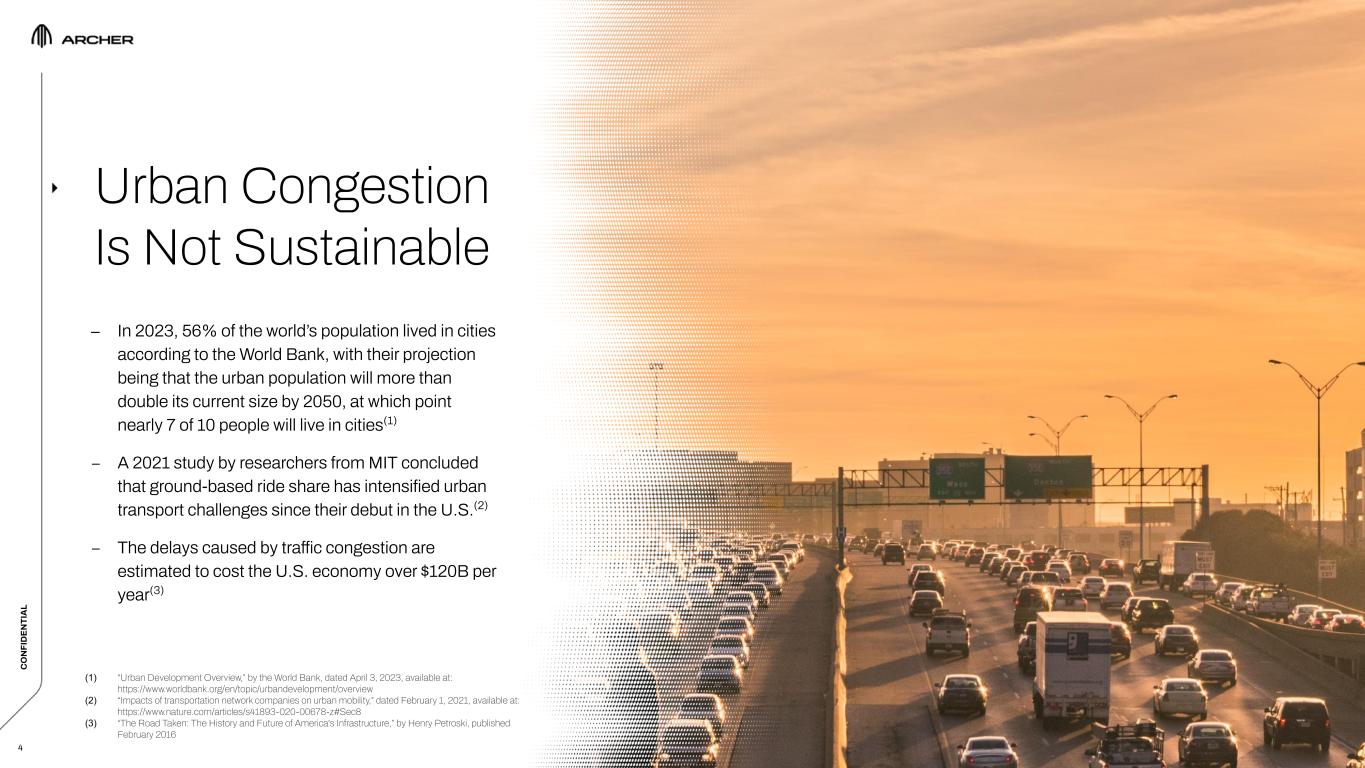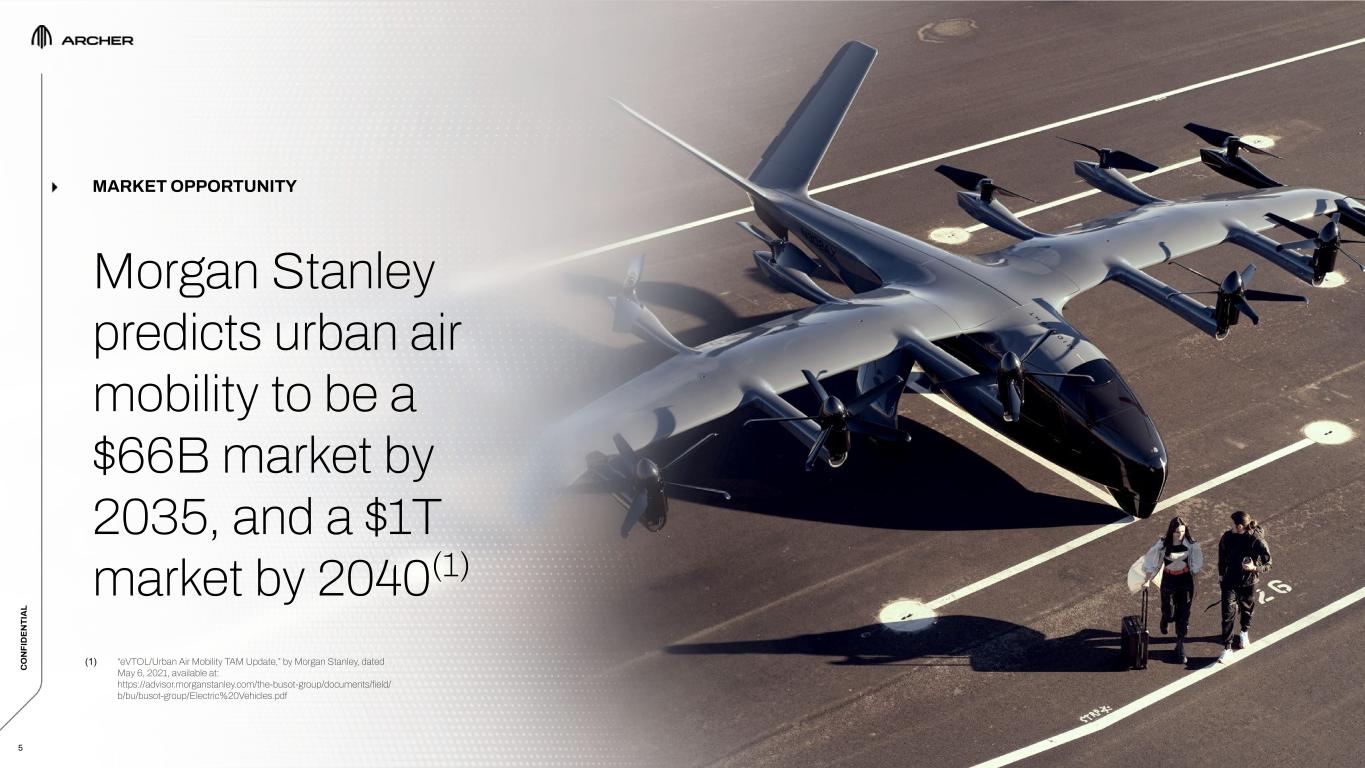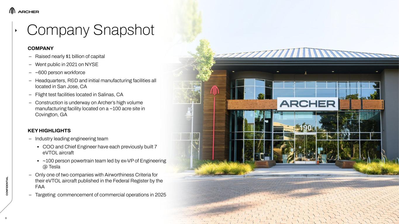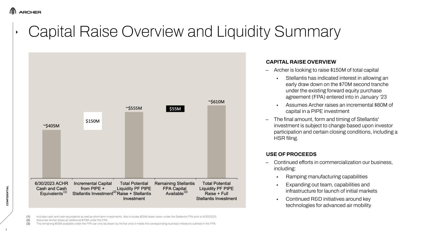C O N FI D EN TI A L C O N FI D EN TI A L 2 This confidential presentation (this “Presentation”) contains certain information pertaining to Archer Aviation Inc. (collectively with its subsidiaries, the “Company”). This Presentation is being provided solely to assist the recipient in determining whether it wishes to proceed with conducting its own due diligence investigation of the Company and a potential transaction (the “Transaction”). The Company does not intend for this Presentation to form the basis of any transaction decision by the recipient. ANY TRANSACTION WITH THE COMPANY INVOLVES A HIGH DEGREE OF RISK. Any party to a transaction should inquire into, independently investigate and consider such risks in its due diligence investigation before entering into any transaction. This Presentation contains “forward-looking statements” within the meaning of the safe harbor provisions of the Private Securities Litigation Reform Act of 1995. All statements other than statements of historical fact are forward-looking statements. These statements include statements regarding the Company’s future business plans and product roadmaps, and the expected timing thereof, including statements regarding the development, commercialization, manufacturing, and specifications of the Company’s eVTOL aircraft, the proposed terms of the Transaction and use of proceeds, the buildout and deployment of the Company’s urban air mobility (“UAM”) network, the projected size of the future urban air mobility market, and the timeline for FAA certification, commercialization and operations of the Company’s eVTOL aircraft. The words “believe,” “may,” “will,” “estimate,” “potential,” “continue,” “anticipate,” “intend,” “expect,” “could,” “would,” “project,” “plan,” “target,” and similar expressions are intended to identify forward-looking statements. Forward-looking statements are based on management’s expectations, assumptions, and projections based on information available at the time the statements were made. The Company’s future financial condition and results of operations, as well as any forward-looking statements, are subject to change due to inherent risks and uncertainties, many of which are beyond the Company’s control. Important factors that could cause the Company’s actual results, performance and achievements, or industry results to differ materially from estimates or projections contained in or implied by the Company’s forward-looking statements include the following: the early stage nature of the Company’s business and past and projected future losses; the Company’s ability to design, develop, certify, manufacture and commercialize aircraft and UAM ecosystem; the Company’s dependence on United Airlines for current aircraft orders, which are subject to conditions, further negotiation and reaching mutual agreement on certain material terms, and the risk that United Airlines cancels those orders; the Company’s ability to remediate material weaknesses in internal control over financial reporting and ability to maintain an effective system of internal control; the effectiveness of the Company’s marketing and growth strategies, including the Company’s ability to effectively market electric air transportation as a substitute for conventional methods of transportation; the Company’s ability to compete in the UAM and eVTOL industries; the Company’s ability to obtain any required certifications, licenses, approvals, or authorizations from governmental authorities; the Company’s ability to achieve its business milestones and launch products and services on anticipated timelines; the Company’s dependence on suppliers for the parts and components in its aircraft; the Company’s ability to develop commercial-scale manufacturing capabilities; regulatory requirements and other obstacles outside of the Company’s control that slow market adoption of electric aircraft, such as the inability to obtain and maintain adequate vertiport infrastructure; the Company’s ability to hire, train and retain qualified personnel; risks related to the Company’s UAM ecosystem operating in densely populated metropolitan areas and heavily regulated airports; adverse publicity from accidents involving electric aircraft or lithium-ion battery cells; the impact of labor and union activities on the Company’s workforce; losses resulting from indexed price escalation clauses in purchase orders; regulatory risks related to evolving laws and regulations in the Company’s industry; the impact of macroeconomic conditions, inflation, interest rates, war, including the ongoing conflict in Ukraine, natural disasters, outbreaks and pandemics, on the Company’s business and the global economy; the Company’s need for and the availability of additional capital; cybersecurity risks; and risks and costs associated with the Company’s ongoing litigation with Wisk Aero LLC. The Company does not undertake any obligation to update or release any revisions to any forward-looking statement or to report any events or circumstances after the date hereof or to reflect the occurrence of unanticipated events, except as required by law. This Presentation may also contain estimates and other statistical data made by independent parties and by the Company relating to market size and growth and other industry data. Such data involves a number of assumptions and limitations, and you are cautioned not to give undue weight to such estimates. The Company has not independently verified the statistical and other industry data generated by independent parties and contained in this Presentation and, accordingly, it cannot guarantee their accuracy or completeness. In addition, projections, assumptions and estimates of its future performance and the future performance of the markets in which the Company competes are necessarily subject to a high degree of uncer
