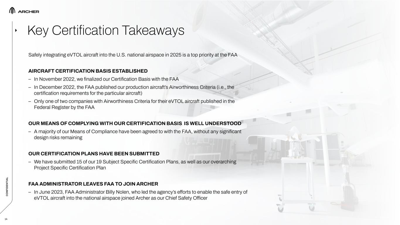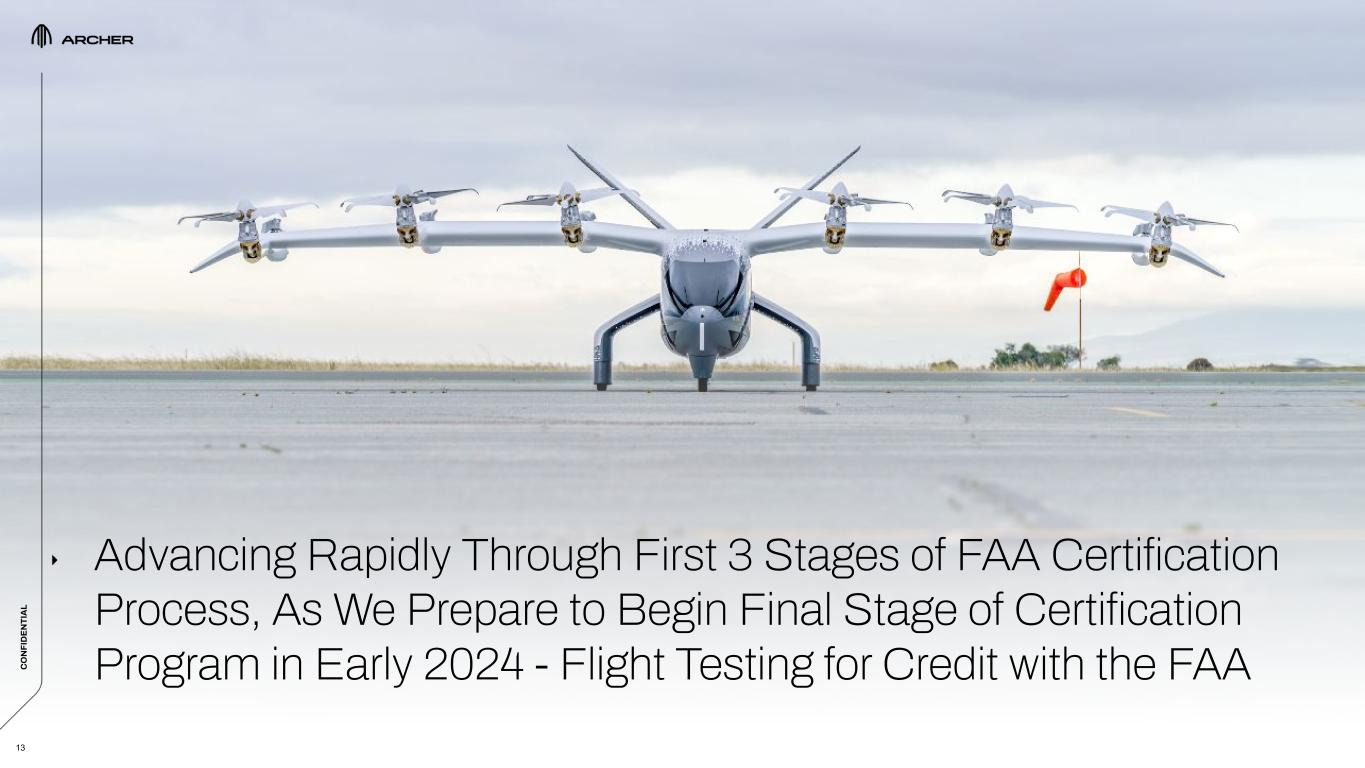 C O N FI D EN TI A L C O N FI D EN TI A L 13 Advancing Rapidly Through First 3 Stages of FAA Certification Process, As We Prepare to Begin Final Stage of Certification Program in Early 2024 - Flight Testing for Credit with the FAAC O N FI D EN TI A L