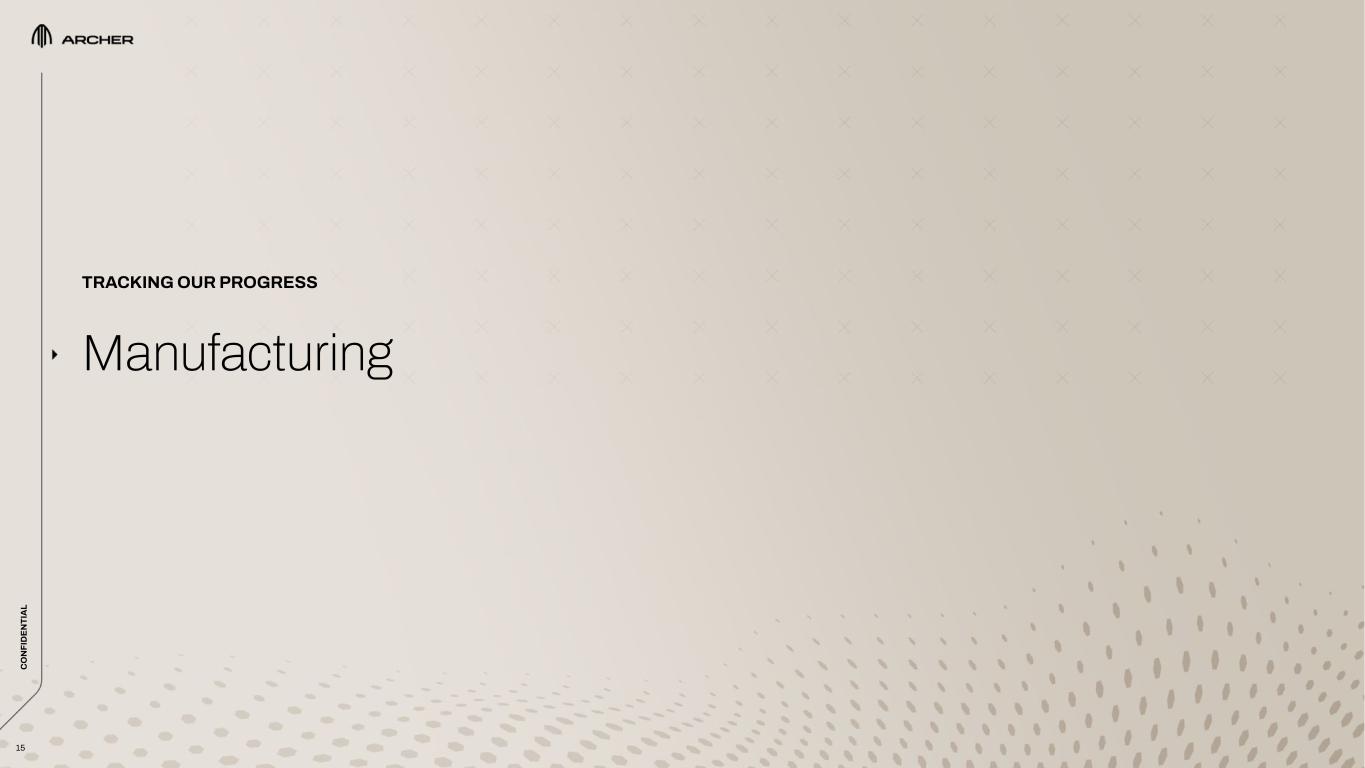 C O N FI D EN TI A L C O N FI D EN TI A L 14 Key Certification Takeaways Safely integrating eVTOL aircraft into the U.S. national airspace in 2025 is a top priority at the FAA AIRCRAFT CERTIFICATION BASIS ESTABLISHED – In November 2022, we finalized our Certification Basis with the FAA – In December 2022, the FAA published our production aircraft’s Airworthiness Criteria (i.e., the certification requirements for the particular aircraft) – Only one of two companies with Airworthiness Criteria for their eVTOL aircraft published in the Federal Register by the FAA OUR MEANS OF COMPLYING WITH OUR CERTIFICATION BASIS IS WELL UNDERSTOOD – A majority of our Means of Compliance have been agreed to with the FAA, without any significant design risks remaining OUR CERTIFICATION PLANS HAVE BEEN SUBMITTED – We have submitted 15 of our 19 Subject Specific Certification Plans, as well as our overarching Project Specific Certification Plan FAA ADMINISTRATOR LEAVES FAA TO JOIN ARCHER – In June 2023, FAA Administrator Billy Nolen, who led the agency’s efforts to enable the safe entry of eVTOL aircraft into the national airspace joined Archer as our Chief Safety Officer