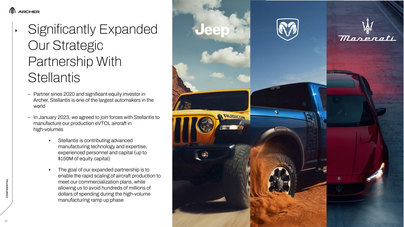 C O N FI D EN TI A L 16 C O N FI D EN TI A L Leading The eVTOL Aircraft Industry In Building Out Manufacturing Capabilities *IMAGE DEPICTS RECENT RENDERING OF ARCHER’S GEORGIA FACTORY, WHICH IS CURRENTLY UNDER CONSTRUCTION