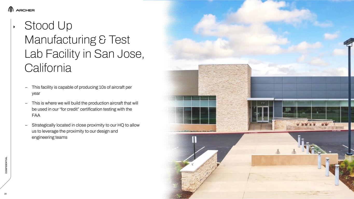 C O N FI D EN TI A L C O N FI D EN TI A L – Partner since 2020 and significant equity investor in Archer, Stellantis is one of the largest automakers in the world – In January 2023, we agreed to join forces with Stellantis to manufacture our production eVTOL aircraft in high-volumes ▪ Stellantis is contributing advanced manufacturing technology and expertise, experienced personnel and capital (up to $150M of equity capital) ▪ The goal of our expanded partnership is to enable the rapid scaling of aircraft production to meet our commercialization plans, while allowing us to avoid hundreds of millions of dollars of spending during the high-volume manufacturing ramp up phase 17 Significantly Expanded Our Strategic Partnership With Stellantis