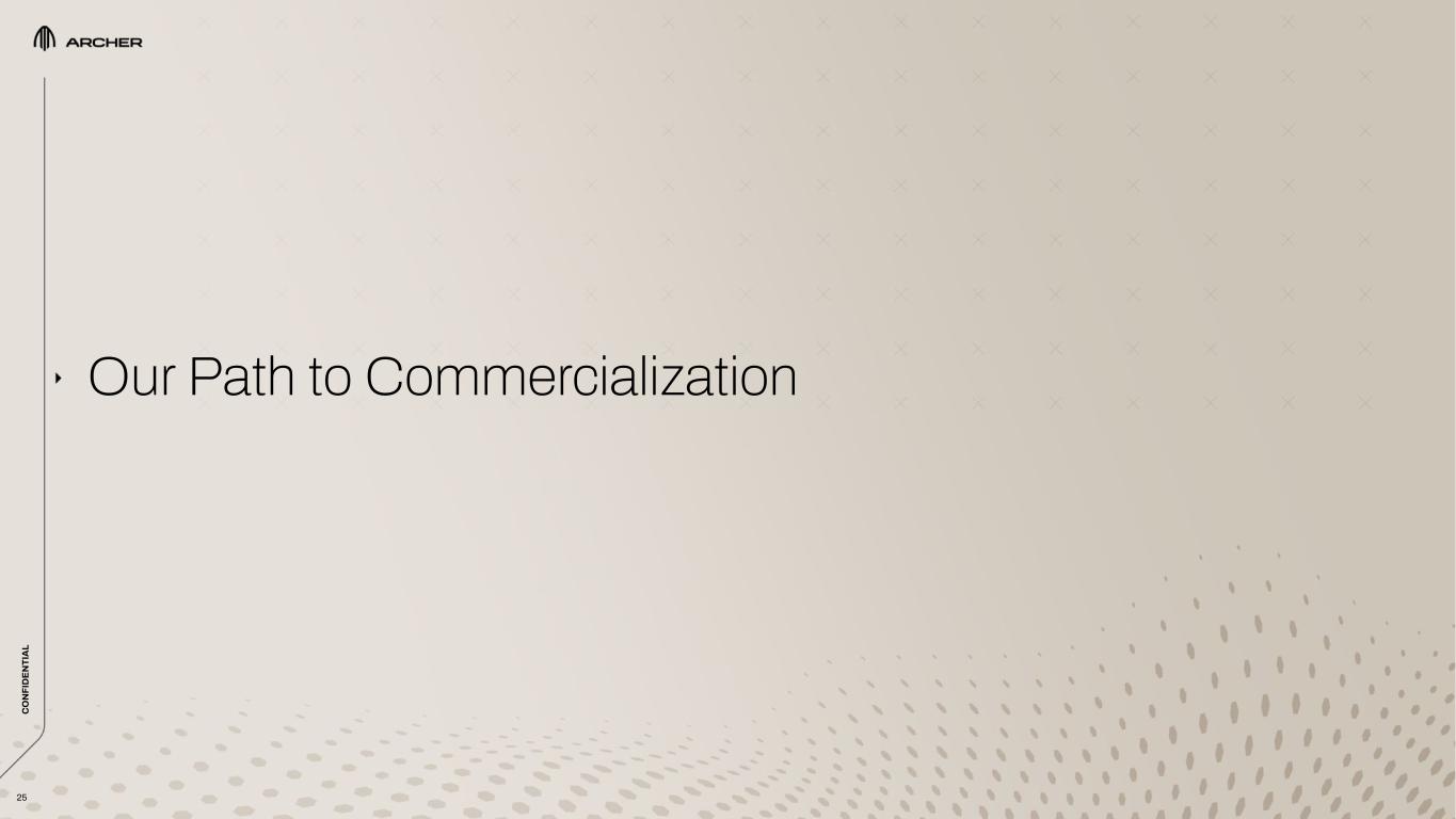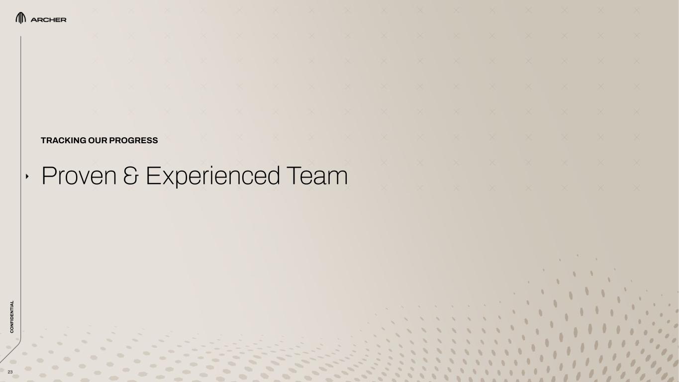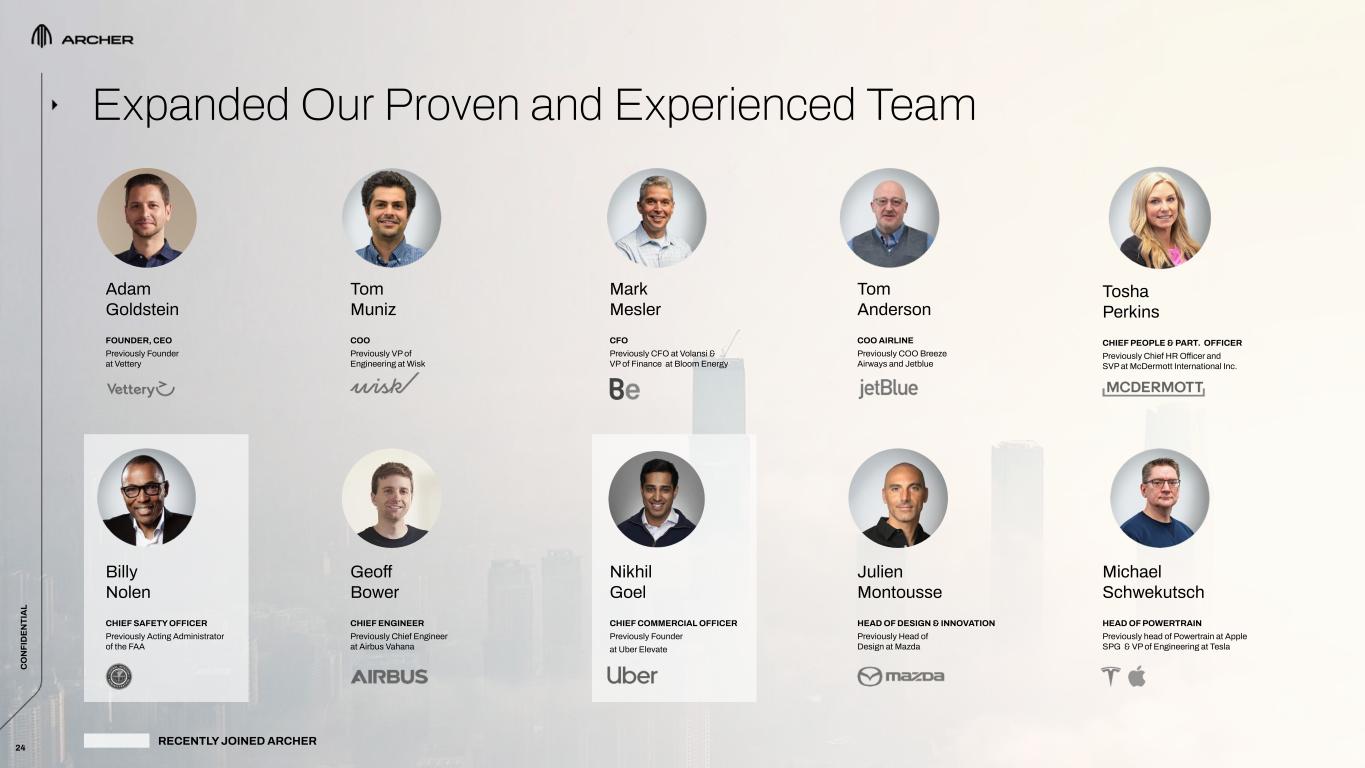 Adam Goldstein FOUNDER, CEO Previously Founder at Vettery Geoff Bower CHIEF ENGINEER Previously Chief Engineer at Airbus Vahana Michael  Schwekutsch HEAD OF POWERTRAIN Previously head of Powertrain at Apple SPG  & VP of Engineering at Tesla Tom Muniz COO Previously VP of Engineering at Wisk Julien  Montousse HEAD OF DESIGN & INNOVATION Previously Head of Design at Mazda Nikhil Goel  CHIEF COMMERCIAL OFFICER Previously Founder at Uber Elevate Mark Mesler CFO Previously CFO at Volansi & VP of Finance at Bloom Energy Tom Anderson COO AIRLINE Previously COO Breeze Airways and Jetblue 24 Expanded Our Proven and Experienced Team Tosha Perkins CHIEF PEOPLE & PART. OFFICER Previously Chief HR Officer and SVP at McDermott International Inc. Billy Nolen CHIEF SAFETY OFFICER Previously Acting Administrator of the FAA C O N FI D EN TI A L RECENTLY JOINED ARCHER