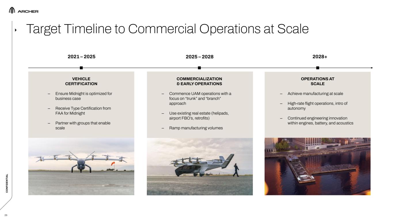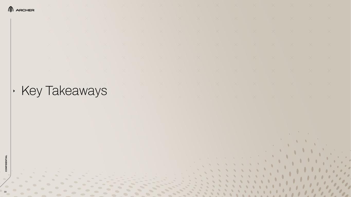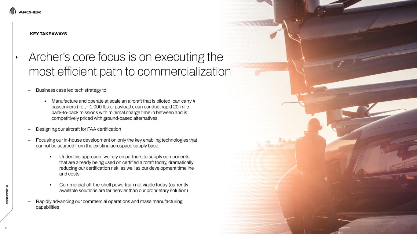 C O N FI D EN TI A L 31 – Business case led tech strategy to: ▪ Manufacture and operate at scale an aircraft that is piloted, can carry 4 passengers (i.e., ~1,000 lbs of payload), can conduct rapid 20-mile back-to-back missions with minimal charge time in between and is competitively priced with ground-based alternatives – Designing our aircraft for FAA certification  – Focusing our in-house development on only the key enabling technologies that cannot be sourced from the existing aerospace supply base: ▪ Under this approach, we rely on partners to supply components that are already being used on certified aircraft today, dramatically reducing our certification risk, as well as our development timeline and costs ▪ Commercial-off-the-shelf powertrain not viable today (currently available solutions are far heavier than our proprietary solution) – Rapidly advancing our commercial operations and mass manufacturing capabilities KEY TAKEAWAYS Archer’s core focus is on executing the most efficient path to commercialization