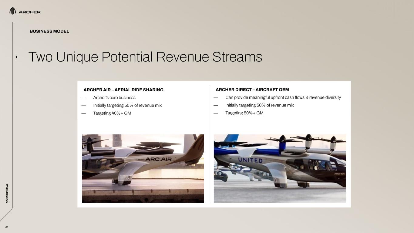 C O N FI D EN TI A L 28 Urban Air Mobility Value Proposition: Saving Time on Urban Commutes C O N FI D EN TI A L – UAM is focused on moving people between 20 to 50 miles, in and around city centers where commutes can take on average an hour or more at a cost that is competitive with ground-based ride share – We have announced early launch markets to focus on highly congested U.S. cities, including New York, Chicago, LA and Miami – The first phase of UAM commercialization is expected to rely heavily on existing and retrofitted infrastructure – As UAM scales, we plan to collaborate with development partners to build high throughput take off and landing locations *IMAGE DEPICTS SIMULATED FLIGHT