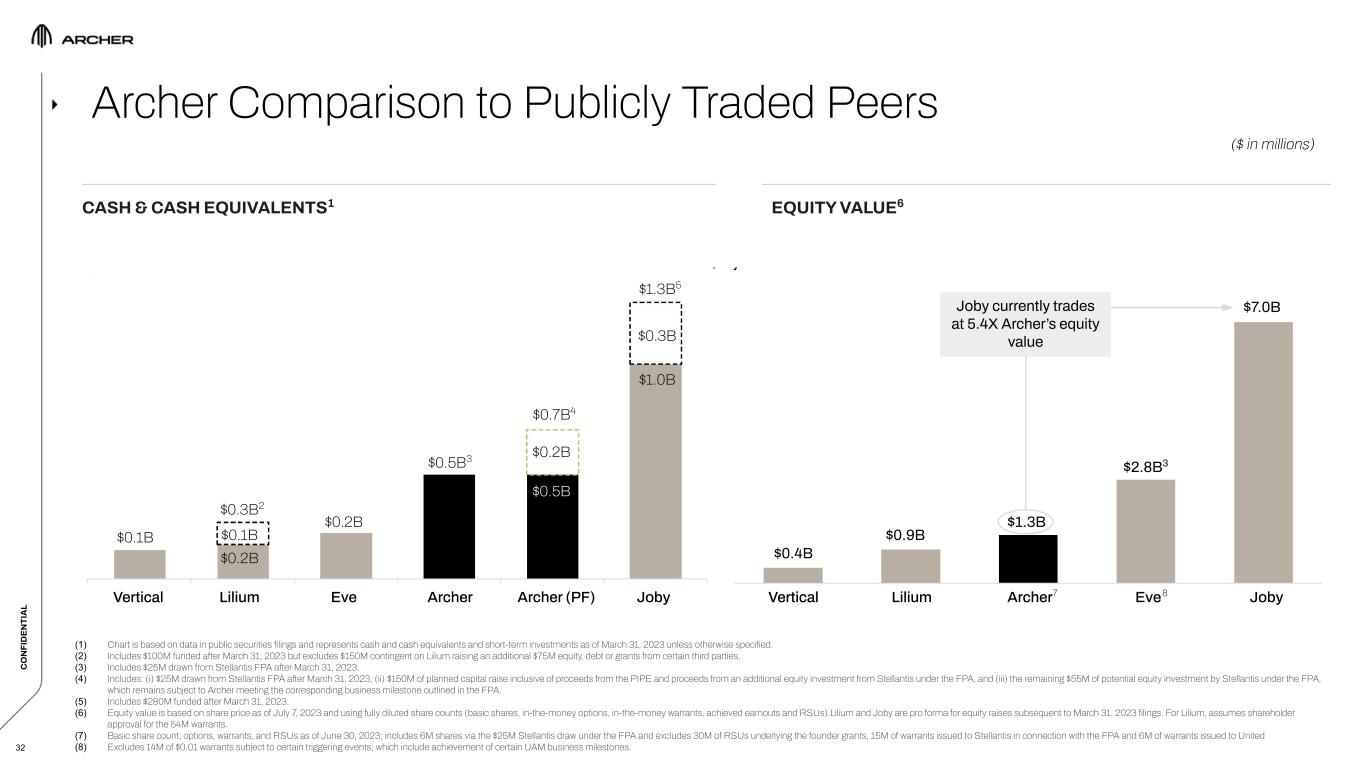 C O N FI D EN TI A L EveArcher Archer Comparison to Publicly Traded Peers CASH & CASH EQUIVALENTS1 EQUITY VALUE6 (1) Chart is based on data in public securities filings and represents cash and cash equivalents and short-term investments as of March 31, 2023 unless otherwise specified. (2) Includes $100M funded after March 31, 2023 but excludes $150M contingent on Lilium raising an additional $75M equity, debt or grants from certain third parties. (3) Includes $25M drawn from Stellantis FPA after March 31, 2023. (4) Includes: (i) $25M drawn from Stellantis FPA after March 31, 2023, (ii) $150M of planned capital raise inclusive of proceeds from the PIPE and proceeds from an additional equity investment from Stellantis under the FPA, and (iii) the remaining $55M of potential equity investment by Stellantis under the FPA, which remains subject to Archer meeting the corresponding business milestone outlined in the FPA. (5) Includes $280M funded after March 31, 2023. (6) Equity value is based on share price as of July 7, 2023 and using fully diluted share counts (basic shares, in-the-money options, in-the-money warrants, achieved earnouts and RSUs).Lilium and Joby are pro forma for equity raises subsequent to March 31, 2023 filings. For Lilium, assumes shareholder approval for the 54M warrants. (7) Basic share count, options, warrants, and RSUs as of June 30, 2023; includes 6M shares via the $25M Stellantis draw under the FPA and excludes 30M of RSUs underlying the founder grants, 15M of warrants issued to Stellantis in connection with the FPA and 6M of warrants issued to United (8) Excludes 14M of $0.01 warrants subject to certain triggering events, which include achievement of certain UAM business milestones. ($ in millions) 32 7 $0.1B $0.2B $0.3B2 $0.2B $0.5B3 $0.5B $0.7B4 $1.3B5 $1.0B $0.1B $0.2B $0.3B $0.4B $1.3B $2.8B3 $0.9B $7.0B Vertical Lilium JobyVertical Lilium Eve Archer Archer (PF) Joby 8 Joby currently trades at 5.4X Archer’s equity value