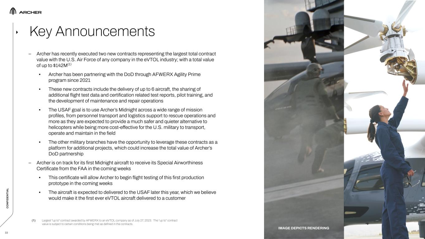 C O N FI D EN TI A L C O N FI D EN TI A L 33 Key Announcements – Archer has recently executed two new contracts representing the largest total contract value with the U.S. Air Force of any company in the eVTOL industry; with a total value of up to $142M(1) ▪ Archer has been partnering with the DoD through AFWERX Agility Prime program since 2021 ▪ These new contracts include the delivery of up to 6 aircraft, the sharing of additional flight test data and certification related test reports, pilot training, and the development of maintenance and repair operations ▪ The USAF goal is to use Archer’s Midnight across a wide range of mission profiles, from personnel transport and logistics support to rescue operations and more as they are expected to provide a much safer and quieter alternative to helicopters while being more cost-effective for the U.S. military to transport, operate and maintain in the field ▪ The other military branches have the opportunity to leverage these contracts as a platform for additional projects, which could increase the total value of Archer’s DoD partnership – Archer is on track for its first Midnight aircraft to receive its Special Airworthiness Certificate from the FAA in the coming weeks ▪ This certificate will allow Archer to begin flight testing of this first production prototype in the coming weeks ▪ The aircraft is expected to delivered to the USAF later this year, which we believe would make it the first ever eVTOL aircraft delivered to a customer (1) Largest "up to" contract awarded by AFWERX to an eVTOL company as of July 27, 2023. The “up to” contract value is subject to certain conditions being met as defined in the contracts. IMAGE DEPICTS RENDERING