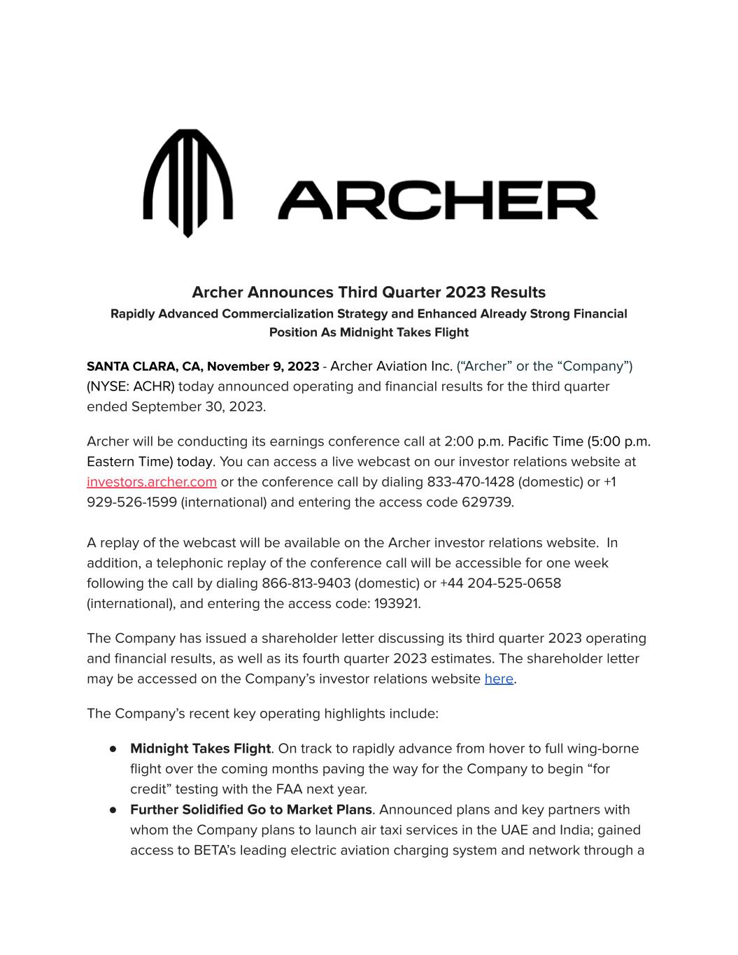 Archer Announces Third Quarter 2023 Results Rapidly Advanced Commercialization Strategy and Enhanced Already Strong Financial Position As Midnight Takes Flight SANTA CLARA, CA, November 9, 2023 - Archer Aviation Inc. (“Archer” or the “Company”) (NYSE: ACHR) today announced operating and financial results for the third quarter ended September 30, 2023. Archer will be conducting its earnings conference call at 2:00 p.m. Pacific Time (5:00 p.m. Eastern Time) today. You can access a live webcast on our investor relations website at investors.archer.com or the conference call by dialing 833-470-1428 (domestic) or +1 929-526-1599 (international) and entering the access code 629739. A replay of the webcast will be available on the Archer investor relations website. In addition, a telephonic replay of the conference call will be accessible for one week following the call by dialing 866-813-9403 (domestic) or +44 204-525-0658 (international), and entering the access code: 193921. The Company has issued a shareholder letter discussing its third quarter 2023 operating and financial results, as well as its fourth quarter 2023 estimates. The shareholder letter may be accessed on the Company’s investor relations website here. The Company’s recent key operating highlights include: ● Midnight Takes Flight. On track to rapidly advance from hover to full wing-borne flight over the coming months paving the way for the Company to begin “for credit” testing with the FAA next year. ● Further Solidified Go to Market Plans. Announced plans and key partners with whom the Company plans to launch air taxi services in the UAE and India; gained access to BETA’s leading electric aviation charging system and network through a