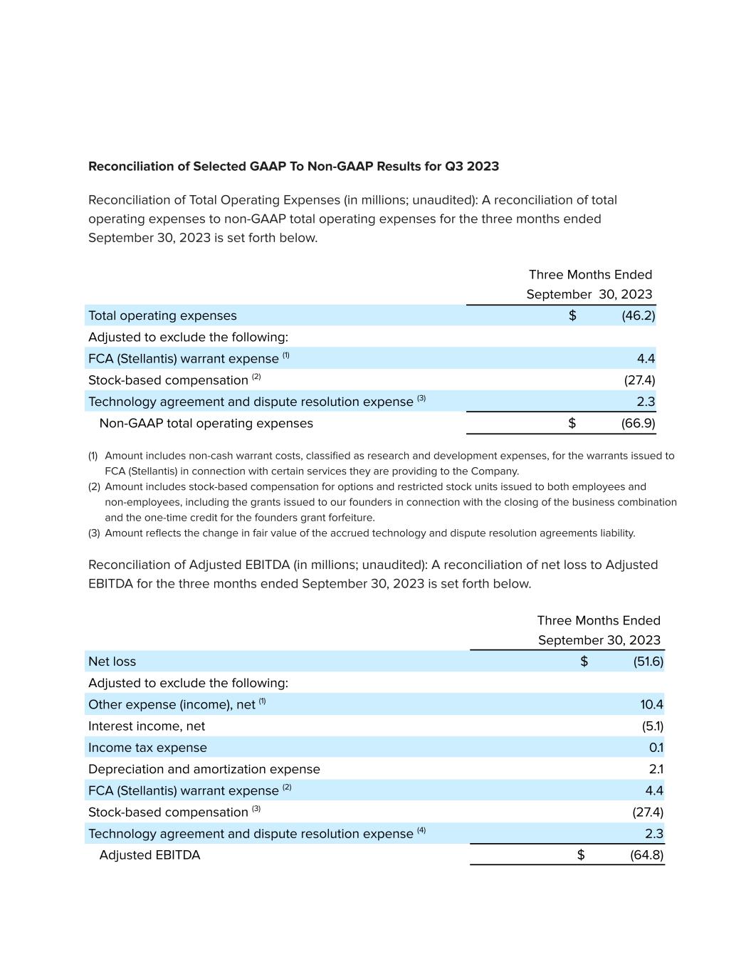 Reconciliation of Selected GAAP To Non-GAAP Results for Q3 2023 Reconciliation of Total Operating Expenses (in millions; unaudited): A reconciliation of total operating expenses to non-GAAP total operating expenses for the three months ended September 30, 2023 is set forth below. Three Months Ended September 30, 2023 Total operating expenses $ (46.2) Adjusted to exclude the following: FCA (Stellantis) warrant expense (1) 4.4 Stock-based compensation (2) (27.4) Technology agreement and dispute resolution expense (3) 2.3 Non-GAAP total operating expenses $ (66.9) (1) Amount includes non-cash warrant costs, classified as research and development expenses, for the warrants issued to FCA (Stellantis) in connection with certain services they are providing to the Company. (2) Amount includes stock-based compensation for options and restricted stock units issued to both employees and non-employees, including the grants issued to our founders in connection with the closing of the business combination and the one-time credit for the founders grant forfeiture. (3) Amount reflects the change in fair value of the accrued technology and dispute resolution agreements liability. Reconciliation of Adjusted EBITDA (in millions; unaudited): A reconciliation of net loss to Adjusted EBITDA for the three months ended September 30, 2023 is set forth below. Three Months Ended September 30, 2023 Net loss $ (51.6) Adjusted to exclude the following: Other expense (income), net (1) 10.4 Interest income, net (5.1) Income tax expense 0.1 Depreciation and amortization expense 2.1 FCA (Stellantis) warrant expense (2) 4.4 Stock-based compensation (3) (27.4) Technology agreement and dispute resolution expense (4) 2.3 Adjusted EBITDA $ (64.8)