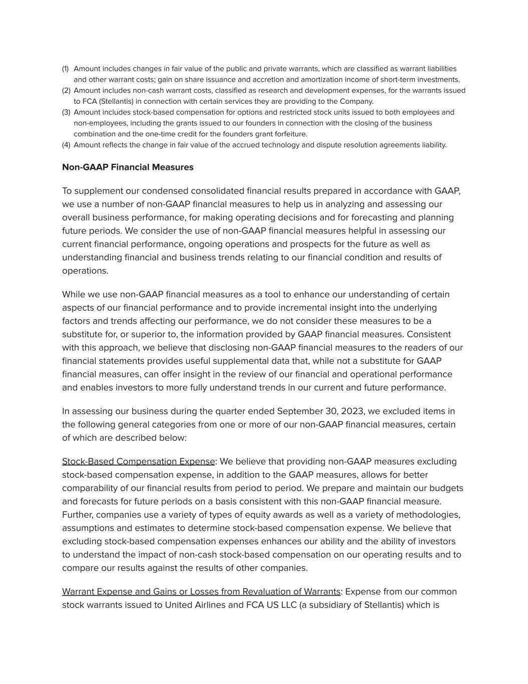 (1) Amount includes changes in fair value of the public and private warrants, which are classified as warrant liabilities and other warrant costs; gain on share issuance and accretion and amortization income of short-term investments. (2) Amount includes non-cash warrant costs, classified as research and development expenses, for the warrants issued to FCA (Stellantis) in connection with certain services they are providing to the Company. (3) Amount includes stock-based compensation for options and restricted stock units issued to both employees and non-employees, including the grants issued to our founders in connection with the closing of the business combination and the one-time credit for the founders grant forfeiture. (4) Amount reflects the change in fair value of the accrued technology and dispute resolution agreements liability. Non-GAAP Financial Measures To supplement our condensed consolidated financial results prepared in accordance with GAAP, we use a number of non-GAAP financial measures to help us in analyzing and assessing our overall business performance, for making operating decisions and for forecasting and planning future periods. We consider the use of non-GAAP financial measures helpful in assessing our current financial performance, ongoing operations and prospects for the future as well as understanding financial and business trends relating to our financial condition and results of operations. While we use non-GAAP financial measures as a tool to enhance our understanding of certain aspects of our financial performance and to provide incremental insight into the underlying factors and trends affecting our performance, we do not consider these measures to be a substitute for, or superior to, the information provided by GAAP financial measures. Consistent with this approach, we believe that disclosing non-GAAP financial measures to the readers of our financial statements provides useful supplemental data that, while not a substitute for GAAP financial measures, can offer insight in the review of our financial and operational performance and enables investors to more fully understand trends in our current and future performance. In assessing our business during the quarter ended September 30, 2023, we excluded items in the following general categories from one or more of our non-GAAP financial measures, certain of which are described below: Stock-Based Compensation Expense: We believe that providing non-GAAP measures excluding stock-based compensation expense, in addition to the GAAP measures, allows for better comparability of our financial results from period to period. We prepare and maintain our budgets and forecasts for future periods on a basis consistent with this non-GAAP financial measure. Further, companies use a variety of types of equity awards as well as a variety of methodologies, assumptions and estimates to determine stock-based compensation expense. We believe that excluding stock-based compensation expenses enhances our ability and the ability of investors to understand the impact of non-cash stock-based compensation on our operating results and to compare our results against the results of other companies. Warrant Expense and Gains or Losses from Revaluation of Warrants: Expense from our common stock warrants issued to United Airlines and FCA US LLC (a subsidiary of Stellantis) which is