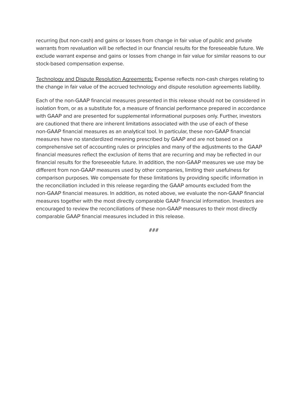 recurring (but non-cash) and gains or losses from change in fair value of public and private warrants from revaluation will be reflected in our financial results for the foreseeable future. We exclude warrant expense and gains or losses from change in fair value for similar reasons to our stock-based compensation expense. Technology and Dispute Resolution Agreements: Expense reflects non-cash charges relating to the change in fair value of the accrued technology and dispute resolution agreements liability. Each of the non-GAAP financial measures presented in this release should not be considered in isolation from, or as a substitute for, a measure of financial performance prepared in accordance with GAAP and are presented for supplemental informational purposes only. Further, investors are cautioned that there are inherent limitations associated with the use of each of these non-GAAP financial measures as an analytical tool. In particular, these non-GAAP financial measures have no standardized meaning prescribed by GAAP and are not based on a comprehensive set of accounting rules or principles and many of the adjustments to the GAAP financial measures reflect the exclusion of items that are recurring and may be reflected in our financial results for the foreseeable future. In addition, the non-GAAP measures we use may be different from non-GAAP measures used by other companies, limiting their usefulness for comparison purposes. We compensate for these limitations by providing specific information in the reconciliation included in this release regarding the GAAP amounts excluded from the non-GAAP financial measures. In addition, as noted above, we evaluate the non-GAAP financial measures together with the most directly comparable GAAP financial information. Investors are encouraged to review the reconciliations of these non-GAAP measures to their most directly comparable GAAP financial measures included in this release. ###