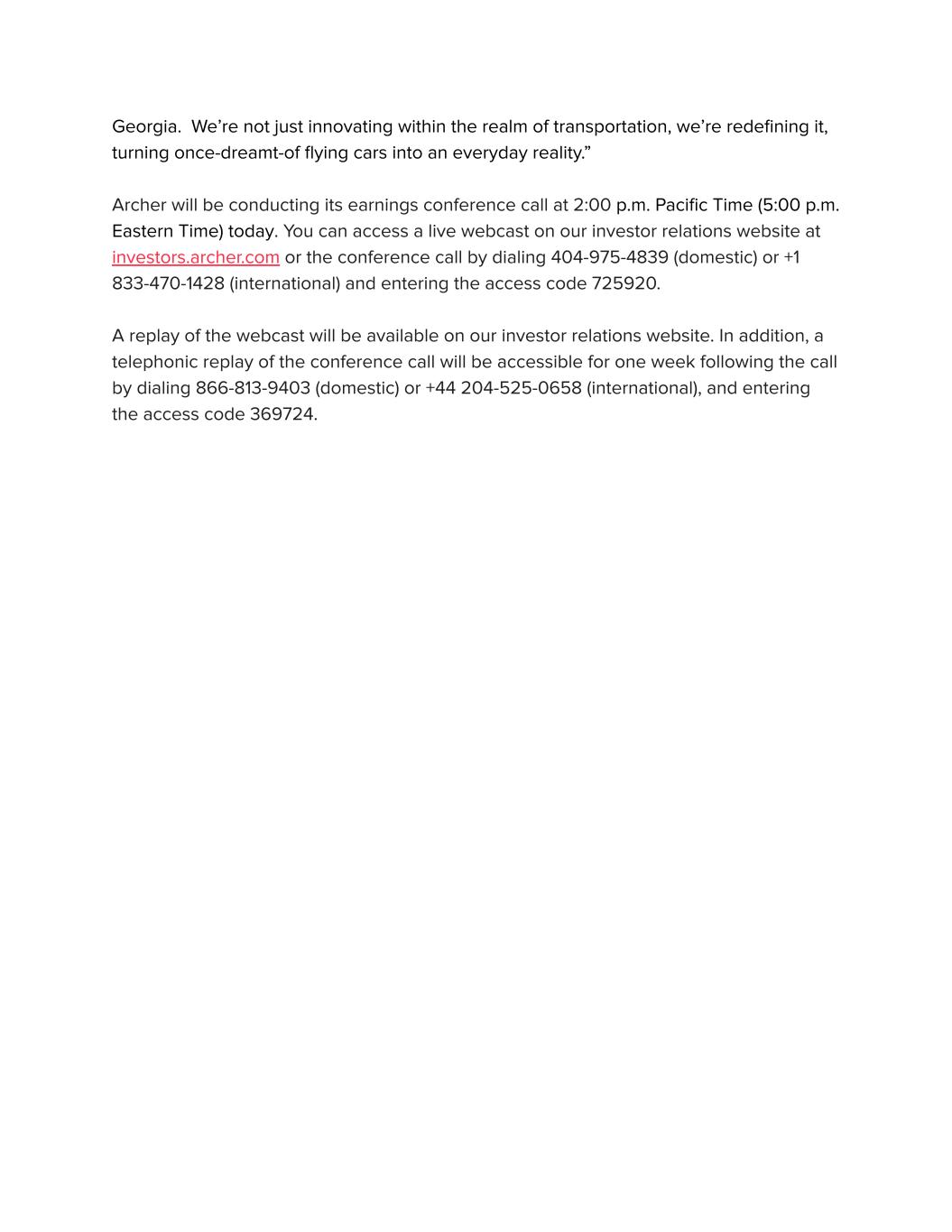 Georgia. We’re not just innovating within the realm of transportation, we’re redefining it, turning once-dreamt-of flying cars into an everyday reality.” Archer will be conducting its earnings conference call at 2:00 p.m. Pacific Time (5:00 p.m. Eastern Time) today. You can access a live webcast on our investor relations website at investors.archer.com or the conference call by dialing 404-975-4839 (domestic) or +1 833-470-1428 (international) and entering the access code 725920. A replay of the webcast will be available on our investor relations website. In addition, a telephonic replay of the conference call will be accessible for one week following the call by dialing 866-813-9403 (domestic) or +44 204-525-0658 (international), and entering the access code 369724.
