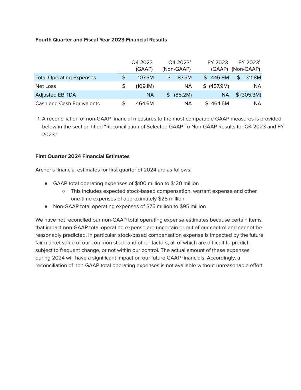 Fourth Quarter and Fiscal Year 2023 Financial Results Q4 2023 (GAAP) Q4 20231 (Non-GAAP) FY 2023 (GAAP) FY 20231 (Non-GAAP) Total Operating Expenses $ 107.3M $ 87.5M $ 446.9M $ 311.8M Net Loss $ (109.1M) NA $ (457.9M) NA Adjusted EBITDA NA $ (85.2M) NA $ (305.3M) Cash and Cash Equivalents $ 464.6M NA $ 464.6M NA 1. A reconciliation of non-GAAP financial measures to the most comparable GAAP measures is provided below in the section titled “Reconciliation of Selected GAAP To Non-GAAP Results for Q4 2023 and FY 2023.” First Quarter 2024 Financial Estimates Archer’s financial estimates for first quarter of 2024 are as follows: ● GAAP total operating expenses of $100 million to $120 million ○ This includes expected stock-based compensation, warrant expense and other one-time expenses of approximately $25 million ● Non-GAAP total operating expenses of $75 million to $95 million We have not reconciled our non-GAAP total operating expense estimates because certain items that impact non-GAAP total operating expense are uncertain or out of our control and cannot be reasonably predicted. In particular, stock-based compensation expense is impacted by the future fair market value of our common stock and other factors, all of which are difficult to predict, subject to frequent change, or not within our control. The actual amount of these expenses during 2024 will have a significant impact on our future GAAP financials. Accordingly, a reconciliation of non-GAAP total operating expenses is not available without unreasonable effort.
