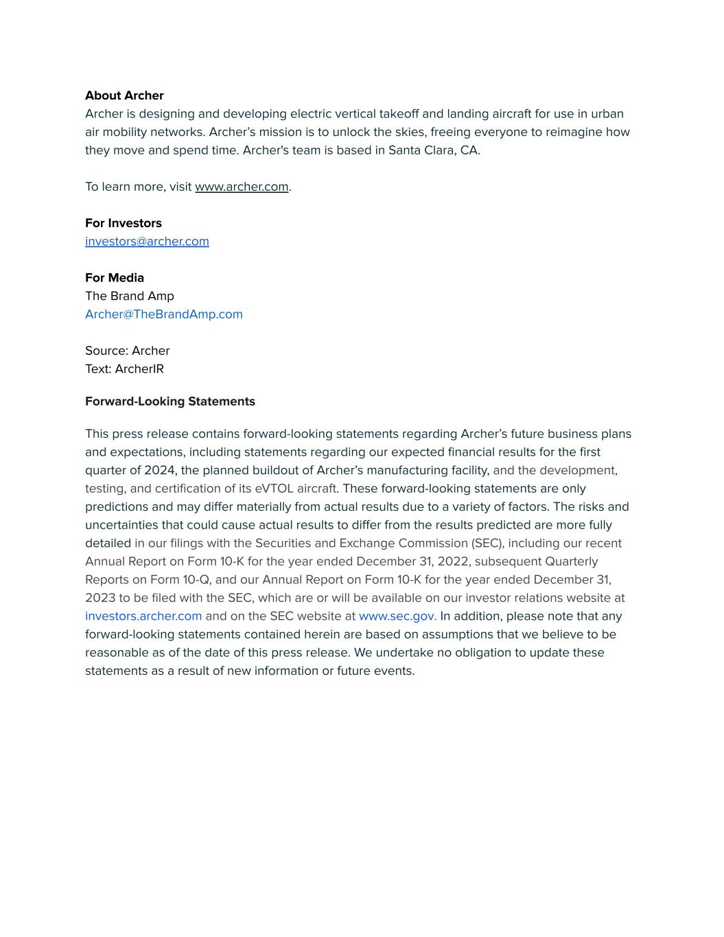 About Archer Archer is designing and developing electric vertical takeoff and landing aircraft for use in urban air mobility networks. Archer’s mission is to unlock the skies, freeing everyone to reimagine how they move and spend time. Archer's team is based in Santa Clara, CA. To learn more, visit www.archer.com. For Investors investors@archer.com For Media The Brand Amp Archer@TheBrandAmp.com Source: Archer Text: ArcherIR Forward-Looking Statements This press release contains forward-looking statements regarding Archer’s future business plans and expectations, including statements regarding our expected financial results for the first quarter of 2024, the planned buildout of Archer’s manufacturing facility, and the development, testing, and certification of its eVTOL aircraft. These forward-looking statements are only predictions and may differ materially from actual results due to a variety of factors. The risks and uncertainties that could cause actual results to differ from the results predicted are more fully detailed in our filings with the Securities and Exchange Commission (SEC), including our recent Annual Report on Form 10-K for the year ended December 31, 2022, subsequent Quarterly Reports on Form 10-Q, and our Annual Report on Form 10-K for the year ended December 31, 2023 to be filed with the SEC, which are or will be available on our investor relations website at investors.archer.com and on the SEC website at www.sec.gov. In addition, please note that any forward-looking statements contained herein are based on assumptions that we believe to be reasonable as of the date of this press release. We undertake no obligation to update these statements as a result of new information or future events.
