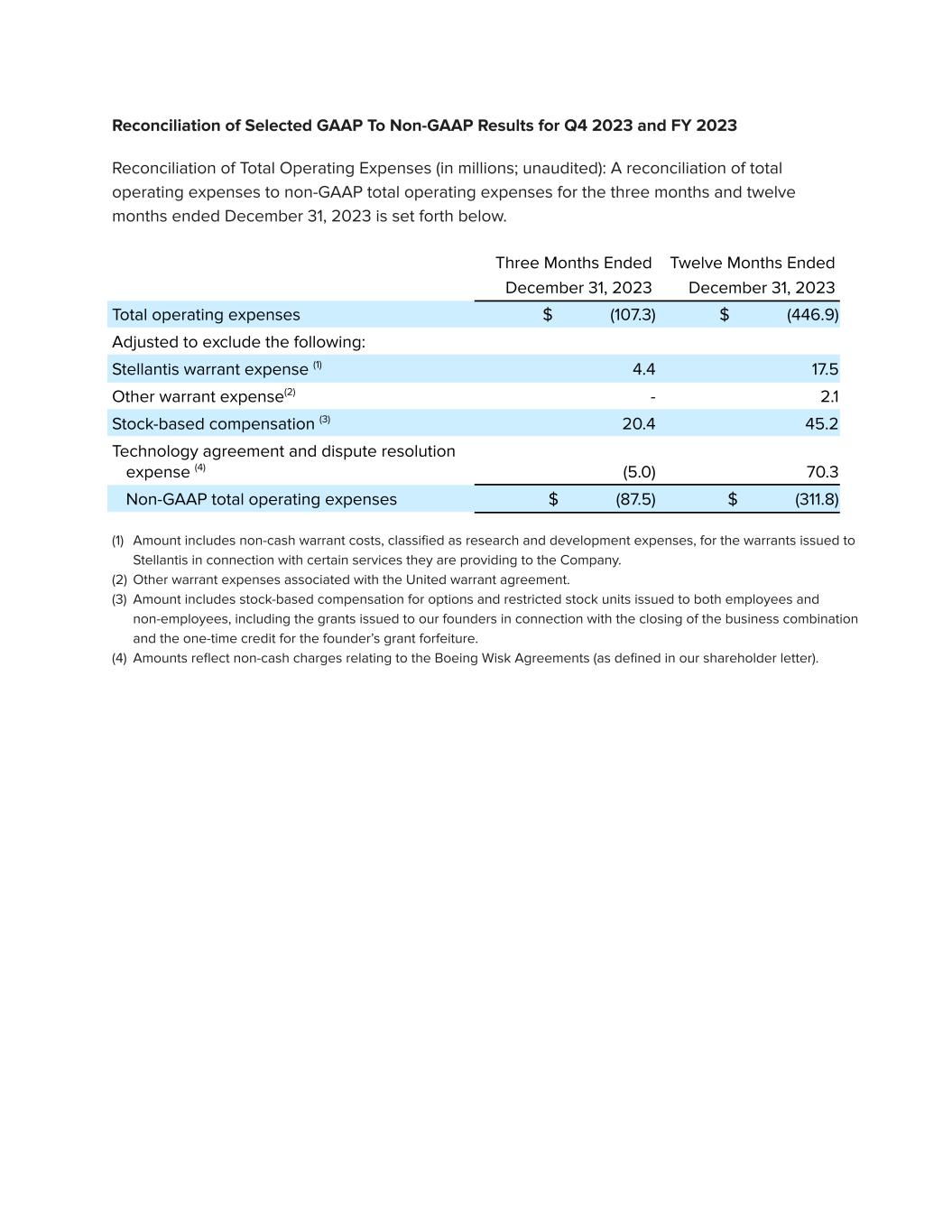 Reconciliation of Selected GAAP To Non-GAAP Results for Q4 2023 and FY 2023 Reconciliation of Total Operating Expenses (in millions; unaudited): A reconciliation of total operating expenses to non-GAAP total operating expenses for the three months and twelve months ended December 31, 2023 is set forth below. Three Months Ended December 31, 2023 Twelve Months Ended December 31, 2023 Total operating expenses $ (107.3) $ (446.9) Adjusted to exclude the following: Stellantis warrant expense (1) 4.4 17.5 Other warrant expense(2) - 2.1 Stock-based compensation (3) 20.4 45.2 Technology agreement and dispute resolution expense (4) (5.0) 70.3 Non-GAAP total operating expenses $ (87.5) $ (311.8) (1) Amount includes non-cash warrant costs, classified as research and development expenses, for the warrants issued to Stellantis in connection with certain services they are providing to the Company. (2) Other warrant expenses associated with the United warrant agreement. (3) Amount includes stock-based compensation for options and restricted stock units issued to both employees and non-employees, including the grants issued to our founders in connection with the closing of the business combination and the one-time credit for the founder’s grant forfeiture. (4) Amounts reflect non-cash charges relating to the Boeing Wisk Agreements (as defined in our shareholder letter).