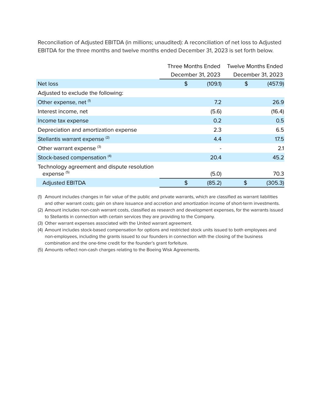 Reconciliation of Adjusted EBITDA (in millions; unaudited): A reconciliation of net loss to Adjusted EBITDA for the three months and twelve months ended December 31, 2023 is set forth below. Three Months Ended December 31, 2023 Twelve Months Ended December 31, 2023 Net loss $ (109.1) $ (457.9) Adjusted to exclude the following: Other expense, net (1) 7.2 26.9 Interest income, net (5.6) (16.4) Income tax expense 0.2 0.5 Depreciation and amortization expense 2.3 6.5 Stellantis warrant expense (2) 4.4 17.5 Other warrant expense (3) - 2.1 Stock-based compensation (4) 20.4 45.2 Technology agreement and dispute resolution expense (5) (5.0) 70.3 Adjusted EBITDA $ (85.2) $ (305.3) (1) Amount includes changes in fair value of the public and private warrants, which are classified as warrant liabilities and other warrant costs; gain on share issuance and accretion and amortization income of short-term investments. (2) Amount includes non-cash warrant costs, classified as research and development expenses, for the warrants issued to Stellantis in connection with certain services they are providing to the Company. (3) Other warrant expenses associated with the United warrant agreement. (4) Amount includes stock-based compensation for options and restricted stock units issued to both employees and non-employees, including the grants issued to our founders in connection with the closing of the business combination and the one-time credit for the founder’s grant forfeiture. (5) Amounts reflect non-cash charges relating to the Boeing Wisk Agreements.