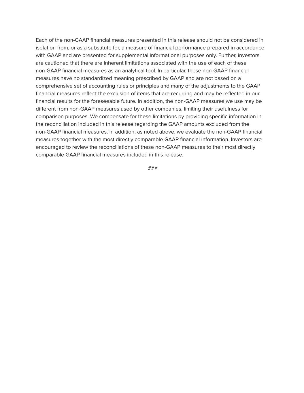 Each of the non-GAAP financial measures presented in this release should not be considered in isolation from, or as a substitute for, a measure of financial performance prepared in accordance with GAAP and are presented for supplemental informational purposes only. Further, investors are cautioned that there are inherent limitations associated with the use of each of these non-GAAP financial measures as an analytical tool. In particular, these non-GAAP financial measures have no standardized meaning prescribed by GAAP and are not based on a comprehensive set of accounting rules or principles and many of the adjustments to the GAAP financial measures reflect the exclusion of items that are recurring and may be reflected in our financial results for the foreseeable future. In addition, the non-GAAP measures we use may be different from non-GAAP measures used by other companies, limiting their usefulness for comparison purposes. We compensate for these limitations by providing specific information in the reconciliation included in this release regarding the GAAP amounts excluded from the non-GAAP financial measures. In addition, as noted above, we evaluate the non-GAAP financial measures together with the most directly comparable GAAP financial information. Investors are encouraged to review the reconciliations of these non-GAAP measures to their most directly comparable GAAP financial measures included in this release. ###