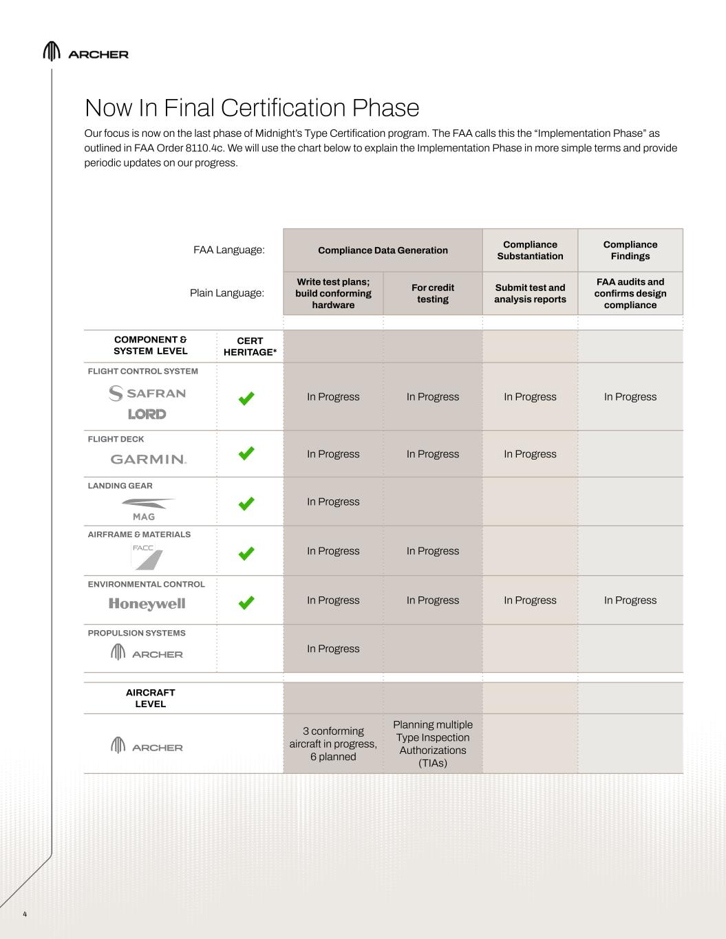 3 80% of Midnight’s Subsystems & Components Have Low Certification Risk * Logos above represent a sampling of the suppliers with others omitted due to confidentiality. AIRFRAME ~80%Certification Heritage Other ~20% FLIGHT CONTROL SYSTEM CABIN FLIGHT DECK AVIONICS ELECTRIC PROPULSION LANDING GEAR ENVIRONMENTAL CONTROL SYSTEM The below graphic is intended to help visually depict which of our subsystems and components are sourced from leading aerospace suppliers with certification heritage, meaning that they are either already flying on hundreds or thousands of other certified aircraft today or that they are derived from other designs which have been previously certified. STRATEGIC SOURCING IS DE-RISKING OUR PATH TO CERTIFICATION