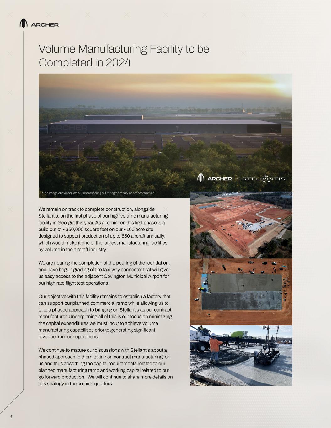 6 We remain on track to complete construction, alongside Stellantis, on the first phase of our high volume manufacturing facility in Georgia this year. As a reminder, this first phase is a build out of ~350,000 square feet on our ~100 acre site designed to support production of up to 650 aircraft annually, which would make it one of the largest manufacturing facilities by volume in the aircraft industry. We are nearing the completion of the pouring of the foundation, and have begun grading of the taxi way connector that will give us easy access to the adjacent Covington Municipal Airport for our high rate flight test operations. Our objective with this facility remains to establish a factory that can support our planned commercial ramp while allowing us to take a phased approach to bringing on Stellantis as our contract manufacturer. Underpinning all of this is our focus on minimizing the capital expenditures we must incur to achieve volume manufacturing capabilities prior to generating significant revenue from our operations. We continue to mature our discussions with Stellantis about a phased approach to them taking on contract manufacturing for us and thus absorbing the capital requirements related to our planned manufacturing ramp and working capital related to our go forward production. We will continue to share more details on this strategy in the coming quarters. *The image above depicts current rendering of Covington facility under construction. Volume Manufacturing Facility to be Completed in 2024