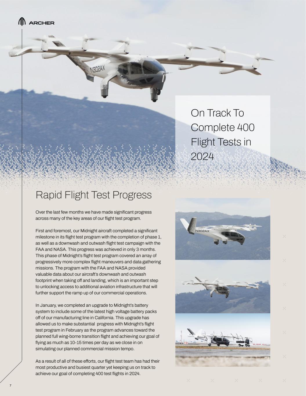 7 Over the last few months we have made significant progress across many of the key areas of our flight test program. First and foremost, our Midnight aircraft completed a significant milestone in its flight test program with the completion of phase 1, as well as a downwash and outwash flight test campaign with the FAA and NASA. This progress was achieved in only 3 months. This phase of Midnight’s flight test program covered an array of progressively more complex flight maneuvers and data gathering missions. The program with the FAA and NASA provided valuable data about our aircraft’s downwash and outwash footprint when taking off and landing, which is an important step to unlocking access to additional aviation infrastructure that will further support the ramp up of our commercial operations. In January, we completed an upgrade to Midnight’s battery system to include some of the latest high voltage battery packs off of our manufacturing line in California. This upgrade has allowed us to make substantial progress with Midnight’s flight test program in February as the program advances toward the planned full wing-borne transition flight and achieving our goal of flying as much as 10-15 times per day as we close in on simulating our planned commercial mission tempo. As a result of all of these efforts, our flight test team has had their most productive and busiest quarter yet keeping us on track to achieve our goal of completing 400 test flights in 2024. On Track To Complete 400 Flight Tests in 2024 Rapid Flight Test Progress