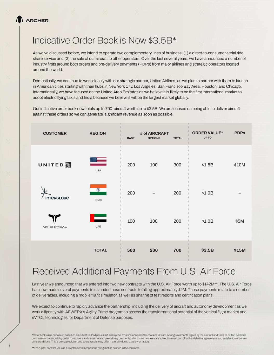 CUSTOMER # of AIRCRAFT BASE OPTIONS TOTAL ORDER VALUE* UP TO REGION TOTAL PDPs 500 $3.5B200 700 $15M 8 200 $1.5B100 300 $10M USA 200 $1.0B– 200 – INDIA 100 $1.0B100 200 $5M UAE As we’ve discussed before, we intend to operate two complementary lines of business: (1) a direct-to-consumer aerial ride share service and (2) the sale of our aircraft to other operators. Over the last several years, we have announced a number of industry firsts around both orders and pre-delivery payments (PDPs) from major airlines and strategic operators located around the world. Domestically, we continue to work closely with our strategic partner, United Airlines, as we plan to partner with them to launch in American cities starting with their hubs in New York City, Los Angeles, San Francisco Bay Area, Houston, and Chicago. Internationally, we have focused on the United Arab Emirates as we believe it is likely to be the first international market to adopt electric flying taxis and India because we believe it will be the largest market globally. Our indicative order book now totals up to 700 aircraft worth up to $3.5B. We are focused on being able to deliver aircraft against these orders so we can generate significant revenue as soon as possible. Indicative Order Book is Now $3.5B* Received Additional Payments From U.S. Air Force Last year we announced that we entered into two new contracts with the U.S. Air Force worth up to $142M**. The U.S. Air Force has now made several payments to us under those contracts totalling approximately $2M. These payments relate to a number of deliverables, including a mobile flight simulator, as well as sharing of test reports and certification plans. We expect to continue to rapidly advance the partnership, including the delivery of aircraft and autonomy development as we work diligently with AFWERX’s Agility Prime program to assess the transformational potential of the vertical flight market and eVTOL technologies for Department of Defense purposes. *Order book value calculated based on an indicative $5M per aircraft sales price. This shareholder letter contains forward looking statements regarding the amount and value of certain potential purchases of our aircraft by certain customers and certain related pre-delivery payments, which in some cases are subject to execution of further definitive agreements and satisfaction of certain other conditions. This is only a prediction and actual results may differ materially due to a variety of factors. **The “up to” contract value is subject to certain conditions being met as defined in the contracts.