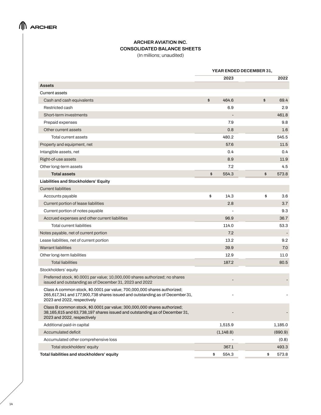 ARCHER AVIATION INC. CONSOLIDATED BALANCE SHEETS (In millions; unaudited) 14 YEAR ENDED DECEMBER 31, 2023 2022 Assets Current assets Cash and cash equivalents $ 464.6 $ 69.4 Restricted cash 6.9 2.9 Short-term investments - 461.8 Prepaid expenses 7.9 9.8 Other current assets 0.8 1.6 Total current assets 480.2 545.5 Property and equipment, net 57.6 11.5 Intangible assets, net 0.4 0.4 Right-of-use assets 8.9 11.9 Other long-term assets 7.2 4.5 Total assets $ 554.3 $ 573.8 Liabilities and Stockholders’ Equity Current liabilities Accounts payable $ 14.3 $ 3.6 Current portion of lease liabilities 2.8 3.7 Current portion of notes payable - 9.3 Accrued expenses and other current liabilities 96.9 36.7 Total current liabilities 114.0 53.3 Notes payable, net of current portion 7.2 - Lease liabilities, net of current portion 13.2 9.2 Warrant liabilities 39.9 7.0 Other long-term liabilities 12.9 11.0 Total liabilities 187.2 80.5 Stockholders’ equity Preferred stock, $0.0001 par value; 10,000,000 shares authorized; no shares issued and outstanding as of December 31, 2023 and 2022 - - Class A common stock, $0.0001 par value; 700,000,000 shares authorized; 265,617,341 and 177,900,738 shares issued and outstanding as of December 31, 2023 and 2022, respectively - - Class B common stock, $0.0001 par value; 300,000,000 shares authorized; 38,165,615 and 63,738,197 shares issued and outstanding as of December 31, 2023 and 2022, respectively - - Additional paid-in capital 1,515.9 1,185.0 Accumulated deficit (1,148.8) (690.9) Accumulated other comprehensive loss - (0.8) Total stockholders’ equity 367.1 493.3 Total liabilities and stockholders’ equity $ 554.3 $ 573.8