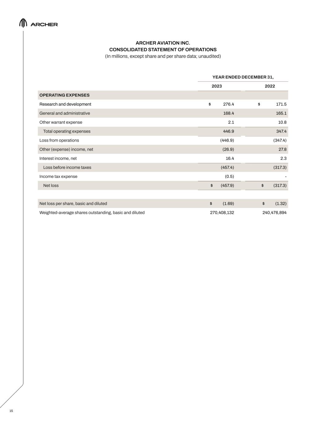 ARCHER AVIATION INC. CONSOLIDATED STATEMENT OF OPERATIONS (In millions, except share and per share data; unaudited) 15 YEAR ENDED DECEMBER 31, 2023 2022 OPERATING EXPENSES Research and development $ 276.4 $ 171.5 General and administrative 168.4 165.1 Other warrant expense 2.1 10.8 Total operating expenses 446.9 347.4 Loss from operations (446.9) (347.4) Other (expense) income, net (26.9) 27.8 Interest income, net 16.4 2.3 Loss before income taxes (457.4) (317.3) Income tax expense (0.5) - Net loss $ (457.9) $ (317.3) Net loss per share, basic and diluted $ (1.69) $ (1.32) Weighted-average shares outstanding, basic and diluted 270,408,132 240,476,894