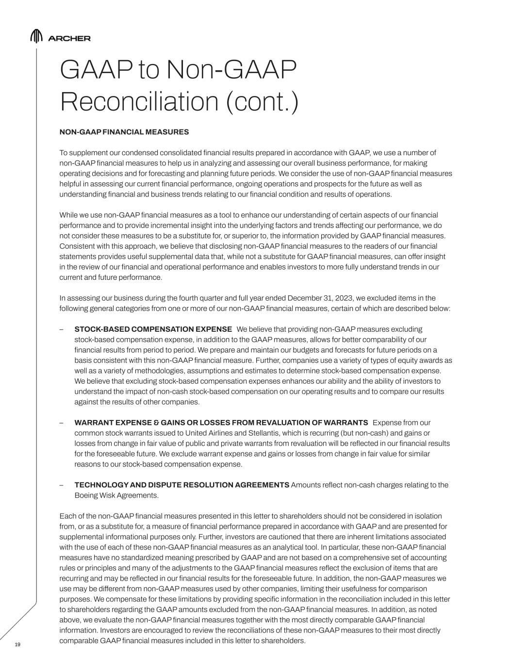 GAAP to Non-GAAP Reconciliation A reconciliation of total operating expenses to non-GAAP total operating expenses for the three months ended December 31, 2023, September 30, 2023, December 31, 2022, and for the twelve months ended December 31, 2023 and December 31, 2022, respectively, are set forth below. RECONCILIATION OF OPERATING EXPENSES (In millions; unaudited) 1) Amounts include non-cash warrant costs, classified as research and development expenses, for the warrants issued to Stellantis, FCA and FCA Italy (both wholly owned subsidiaries of Stellantis), in connection with certain services they are providing to the Company. 2) Other warrant expenses associated with the United warrant agreement. 3) Amounts include stock-based compensation for options and restricted stock units issued to both employees and non-employees, including the grants issued to our founders in connection with the closing of the business combination and the one-time credit for the founder’s grant forfeiture discussed above. 4) Amounts reflect non-cash charges relating to the Boeing Wisk Agreements. 5) One time severance related expenses for former co-CEO. 17 THREE MONTHS ENDED TWELVE MONTHS ENDED DEC 31, 2023 SEP 30, 2023 DEC 31, 2022 DEC 31, 2023 DEC 31, 2022 TOTAL OPERATING EXPENSES $ 107.3 $ 46.2 $ 108.1 $ 446.9 $ 347.4 Adjusted to exclude the following: Stellantis and FCA warrant expense (1) (4.4) (4.4) - (17.5) (2.9) Other warrant expense (2) - - (4.8) (2.1) (10.8) Stock-based compensation (3) (20.4) 27.4 (26.5) (45.2) (102.8) Technology and dispute resolution agreements (4) 5.0 (2.3) - (70.3) - One-time Co-CEO severance expense (5) - - - - (3.4) NON-GAAP TOTAL OPERATING EXPENSES $ 87.5 $ 66.9 $ 76.8 $ 311.8 $ 227.5