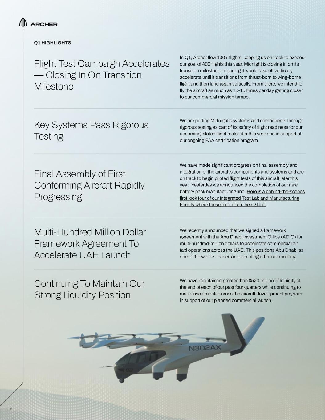 2 Key Systems Pass Rigorous Testing Final Assembly of First Conforming Aircraft Rapidly Progressing Multi-Hundred Million Dollar Framework Agreement To Accelerate UAE Launch We are putting Midnight’s systems and components through rigorous testing as part of its safety of flight readiness for our upcoming piloted flight tests later this year and in support of our ongoing FAA certification program. We have made significant progress on final assembly and integration of the aircraft’s components and systems and are on track to begin piloted flight tests of this aircraft later this year. Yesterday we announced the completion of our new battery pack manufacturing line. Here is a behind-the-scenes first look tour of our Integrated Test Lab and Manufacturing Facility where these aircraft are being built. We recently announced that we signed a framework agreement with the Abu Dhabi Investment Office (ADIO) for multi-hundred-million dollars to accelerate commercial air taxi operations across the UAE. This positions Abu Dhabi as one of the world’s leaders in promoting urban air mobility. Flight Test Campaign Accelerates — Closing In On Transition Milestone In Q1, Archer flew 100+ flights, keeping us on track to exceed our goal of 400 flights this year. Midnight is closing in on its transition milestone, meaning it would take off vertically, accelerate until it transitions from thrust-born to wing-borne flight and then land again vertically. From there, we intend to fly the aircraft as much as 10-15 times per day getting closer to our commercial mission tempo. Continuing To Maintain Our Strong Liquidity Position We have maintained greater than $520 million of liquidity at the end of each of our past four quarters while continuing to make investments across the aircraft development program in support of our planned commercial launch. Q1 HIGHLIGHTS