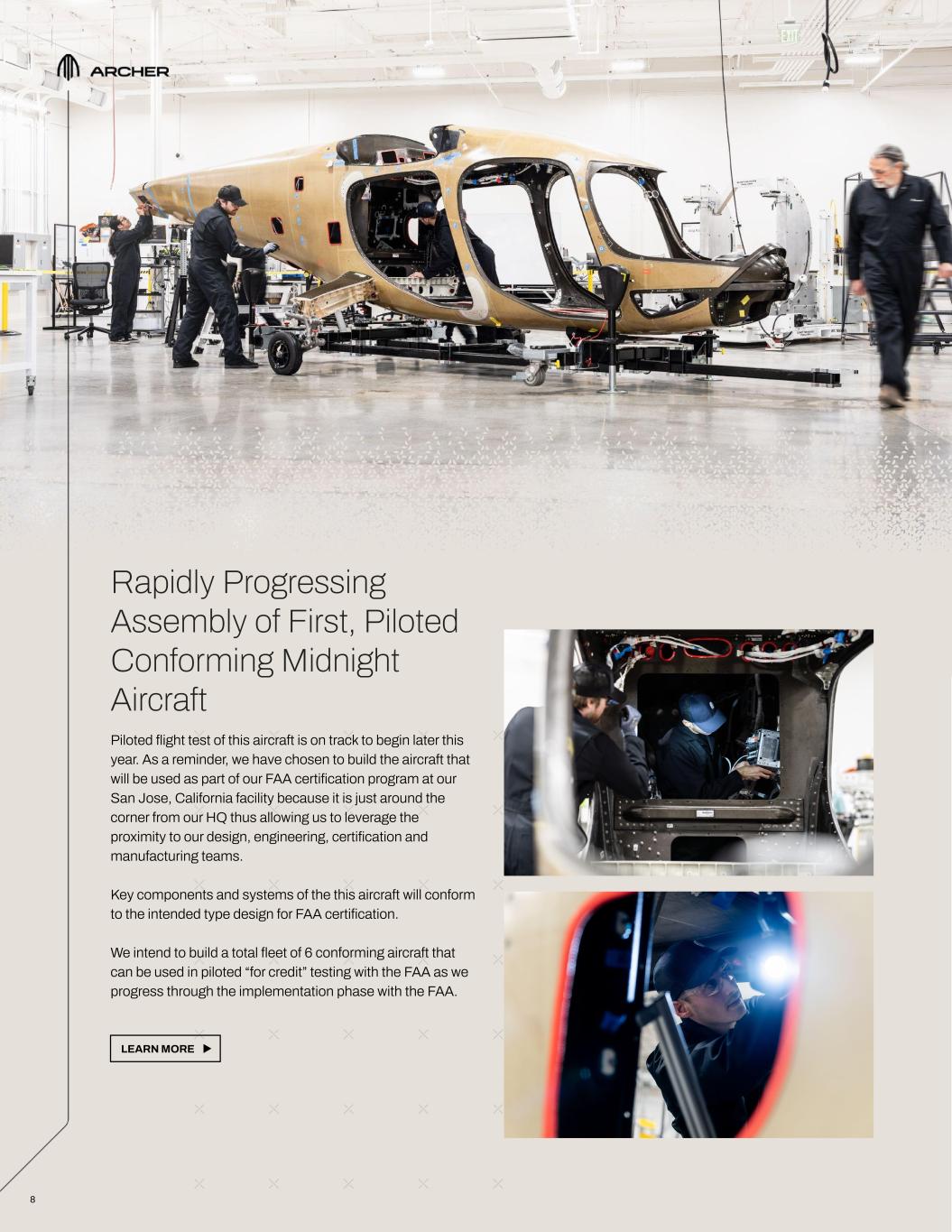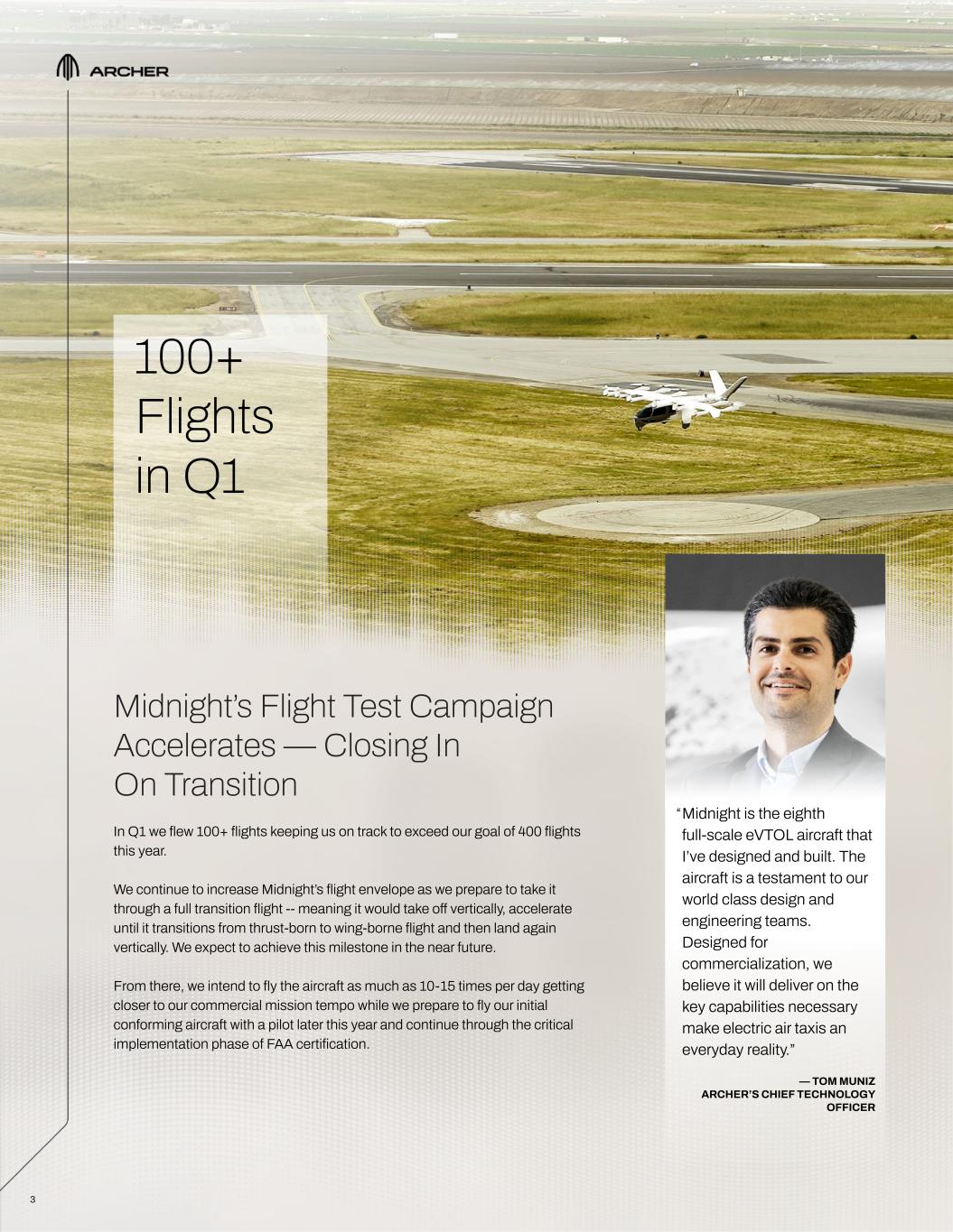 3 Midnight’s Flight Test Campaign Accelerates — Closing In On Transition In Q1 we flew 100+ flights keeping us on track to exceed our goal of 400 flights this year. We continue to increase Midnight’s flight envelope as we prepare to take it through a full transition flight -- meaning it would take off vertically, accelerate until it transitions from thrust-born to wing-borne flight and then land again vertically. We expect to achieve this milestone in the near future. From there, we intend to fly the aircraft as much as 10-15 times per day getting closer to our commercial mission tempo while we prepare to fly our initial conforming aircraft with a pilot later this year and continue through the critical implementation phase of FAA certification. To be update with pic of Tom and Tom quote “ 100+ Flights in Q1 Midnight is the eighth full-scale eVTOL aircraft that I’ve designed and built. The aircraft is a testament to our world class design and engineering teams. Designed for commercialization, we believe it will deliver on the key capabilities necessary make electric air taxis an everyday reality.” — TOM MUNIZ ARCHER’S CHIEF TECHNOLOGY OFFICER “