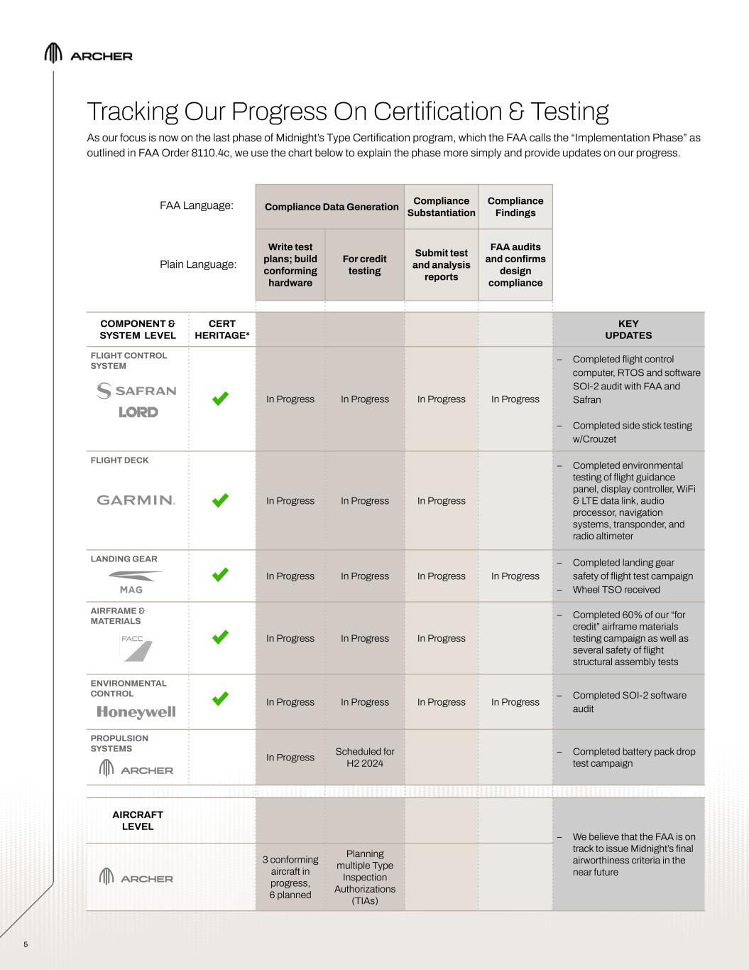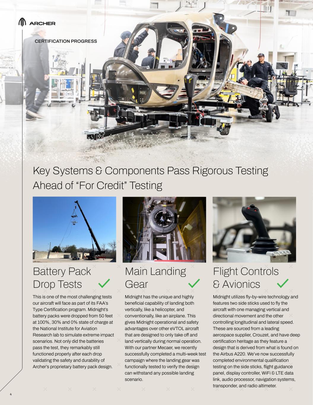 CERTIFICATION PROGRESS 4 Battery Pack Drop Tests This is one of the most challenging tests our aircraft will face as part of its FAA’s Type Certification program. Midnight’s battery packs were dropped from 50 feet at 100%, 30% and 0% state of charge at the National Institute for Aviation Research lab to simulate extreme impact scenarios. Not only did the batteries pass the test, they remarkably still functioned properly after each drop validating the safety and durability of Archer’s proprietary battery pack design. Main Landing Gear Midnight has the unique and highly beneficial capability of landing both vertically, like a helicopter, and conventionally, like an airplane. This gives Midnight operational and safety advantages over other eVTOL aircraft that are designed to only take off and land vertically during normal operation. With our partner Mecaer, we recently successfully completed a multi-week test campaign where the landing gear was functionally tested to verify the design can withstand any possible landing scenario. Flight Controls & Avionics Midnight utilizes fly-by-wire technology and features two side sticks used to fly the aircraft with one managing vertical and directional movement and the other controlling longitudinal and lateral speed. These are sourced from a leading aerospace supplier, Crouzet, and have deep certification heritage as they feature a design that is derived from what is found on the Airbus A220. We’ve now successfully completed environmental qualification testing on the side sticks, flight guidance panel, display controller, WiFi & LTE data link, audio processor, navigation systems, transponder, and radio altimeter. Key Systems & Components Pass Rigorous Testing Ahead of “For Credit” Testing