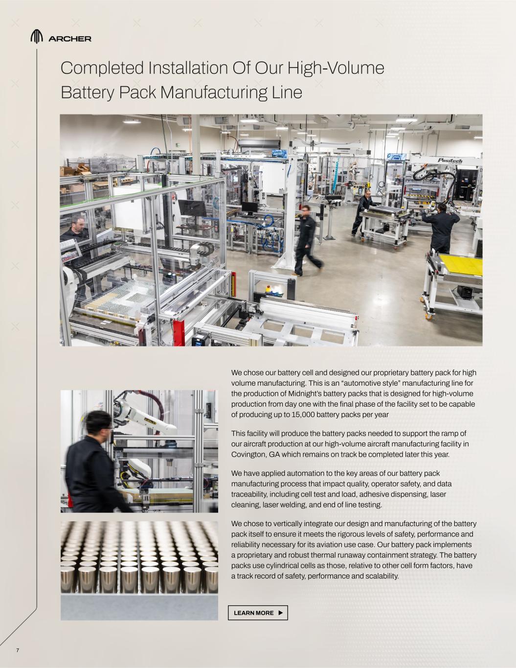 7 Completed Installation Of Our High-Volume Battery Pack Manufacturing Line We chose our battery cell and designed our proprietary battery pack for high volume manufacturing. This is an “automotive style” manufacturing line for the production of Midnight’s battery packs that is designed for high-volume production from day one with the final phase of the facility set to be capable of producing up to 15,000 battery packs per year This facility will produce the battery packs needed to support the ramp of our aircraft production at our high-volume aircraft manufacturing facility in Covington, GA which remains on track be completed later this year. We have applied automation to the key areas of our battery pack manufacturing process that impact quality, operator safety, and data traceability, including cell test and load, adhesive dispensing, laser cleaning, laser welding, and end of line testing. We chose to vertically integrate our design and manufacturing of the battery pack itself to ensure it meets the rigorous levels of safety, performance and reliability necessary for its aviation use case. Our battery pack implements a proprietary and robust thermal runaway containment strategy. The battery packs use cylindrical cells as those, relative to other cell form factors, have a track record of safety, performance and scalability. LEARN MORE
