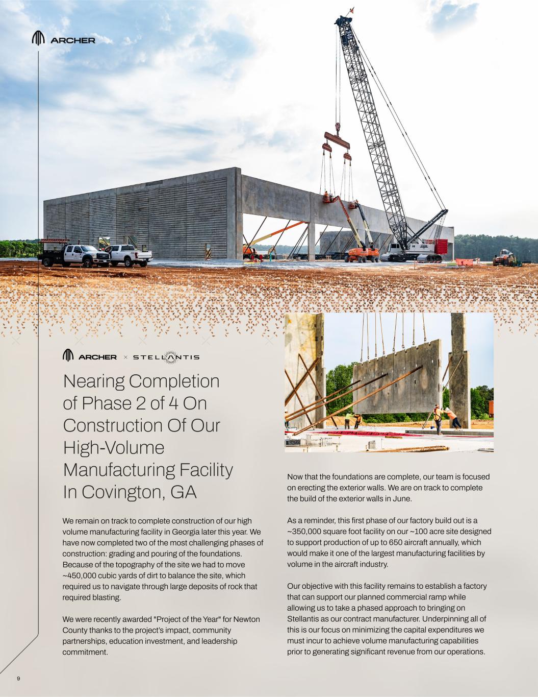 9 Nearing Completion of Phase 2 of 4 On Construction Of Our High-Volume Manufacturing Facility In Covington, GA We remain on track to complete construction of our high volume manufacturing facility in Georgia later this year. We have now completed two of the most challenging phases of construction: grading and pouring of the foundations. Because of the topography of the site we had to move ~450,000 cubic yards of dirt to balance the site, which required us to navigate through large deposits of rock that required blasting. We were recently awarded "Project of the Year" for Newton County thanks to the project’s impact, community partnerships, education investment, and leadership commitment. Now that the foundations are complete, our team is focused on erecting the exterior walls. We are on track to complete the build of the exterior walls in June. As a reminder, this first phase of our factory build out is a ~350,000 square foot facility on our ~100 acre site designed to support production of up to 650 aircraft annually, which would make it one of the largest manufacturing facilities by volume in the aircraft industry. Our objective with this facility remains to establish a factory that can support our planned commercial ramp while allowing us to take a phased approach to bringing on Stellantis as our contract manufacturer. Underpinning all of this is our focus on minimizing the capital expenditures we must incur to achieve volume manufacturing capabilities prior to generating significant revenue from our operations.