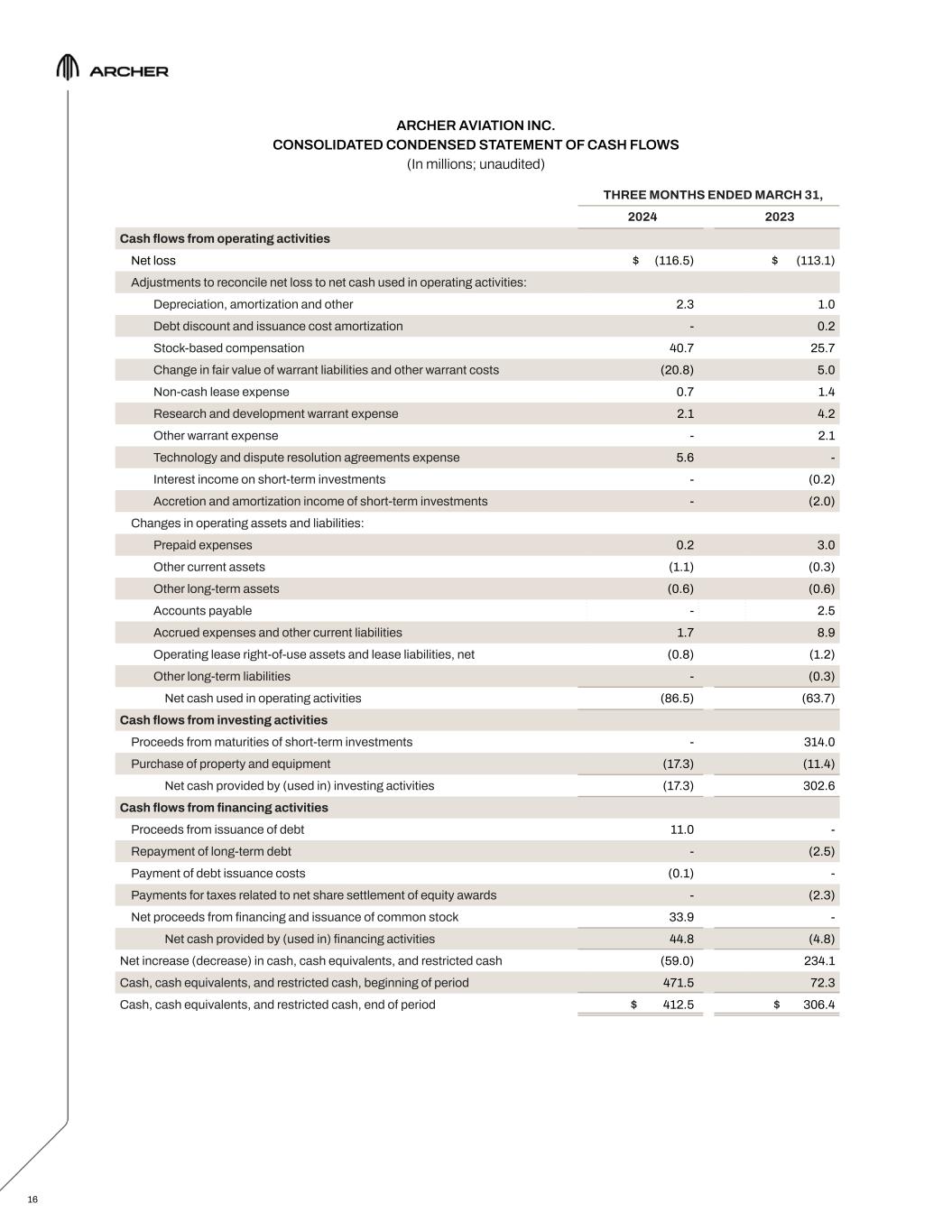ARCHER AVIATION INC. CONSOLIDATED CONDENSED STATEMENT OF CASH FLOWS (In millions; unaudited) 16 THREE MONTHS ENDED MARCH 31, 2024 2023 Cash flows from operating activities Net loss $ (116.5) $ (113.1) Adjustments to reconcile net loss to net cash used in operating activities: Depreciation, amortization and other 2.3 1.0 Debt discount and issuance cost amortization - 0.2 Stock-based compensation 40.7 25.7 Change in fair value of warrant liabilities and other warrant costs (20.8) 5.0 Non-cash lease expense 0.7 1.4 Research and development warrant expense 2.1 4.2 Other warrant expense - 2.1 Technology and dispute resolution agreements expense 5.6 - Interest income on short-term investments - (0.2) Accretion and amortization income of short-term investments - (2.0) Changes in operating assets and liabilities: Prepaid expenses 0.2 3.0 Other current assets (1.1) (0.3) Other long-term assets (0.6) (0.6) Accounts payable - 2.5 Accrued expenses and other current liabilities 1.7 8.9 Operating lease right-of-use assets and lease liabilities, net (0.8) (1.2) Other long-term liabilities - (0.3) Net cash used in operating activities (86.5) (63.7) Cash flows from investing activities Proceeds from maturities of short-term investments - 314.0 Purchase of property and equipment (17.3) (11.4) Net cash provided by (used in) investing activities (17.3) 302.6 Cash flows from financing activities Proceeds from issuance of debt 11.0 - Repayment of long-term debt - (2.5) Payment of debt issuance costs (0.1) - Payments for taxes related to net share settlement of equity awards - (2.3) Net proceeds from financing and issuance of common stock 33.9 - Net cash provided by (used in) financing activities 44.8 (4.8) Net increase (decrease) in cash, cash equivalents, and restricted cash (59.0) 234.1 Cash, cash equivalents, and restricted cash, beginning of period 471.5 72.3 Cash, cash equivalents, and restricted cash, end of period $ 412.5 $ 306.4