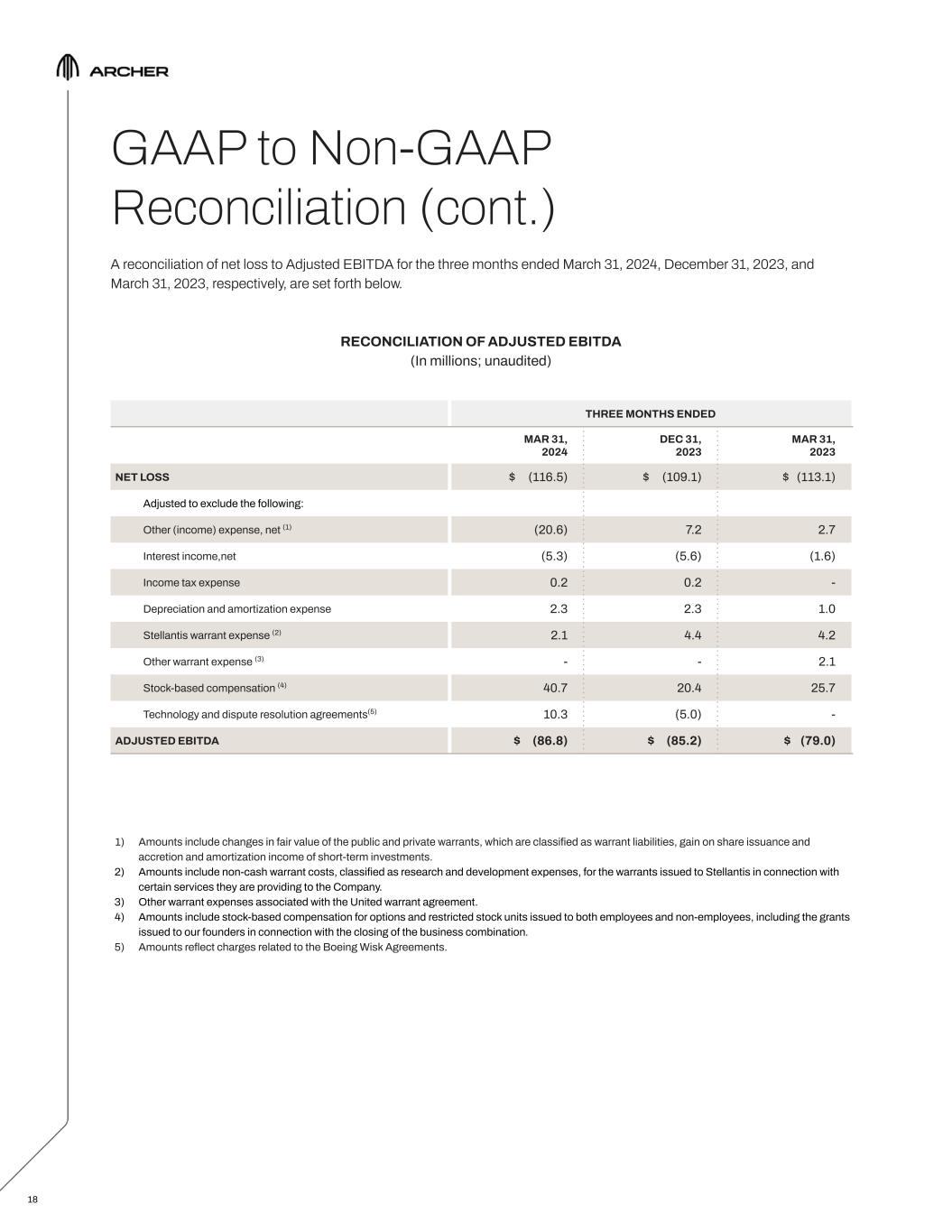 GAAP to Non-GAAP Reconciliation A reconciliation of total operating expenses to non-GAAP total operating expenses for the three months ended March 31, 2024, December 31, 2023, and March 31, 2023, respectively, are set forth below. RECONCILIATION OF OPERATING EXPENSES (In millions; unaudited) 1) Amounts include non-cash warrant costs, classified as research and development expenses, for the warrants issued to Stellantis in connection with certain services they are providing to the Company. 2) Other warrant expenses associated with the United warrant agreement. 3) Amounts include stock-based compensation for options and restricted stock units issued to both employees and non-employees, including the grants issued to our founders in connection with the closing of the business combination. 4) Amounts reflect charges relating to the Boeing Wisk Agreements. 17 THREE MONTHS ENDED MAR 31, 2024 DEC 31, 2023 MAR 31, 2023 TOTAL OPERATING EXPENSES $ 142.2 $ 107.3 $ 112.0 Adjusted to exclude the following: Stellantis warrant expense (1) (2.1) (4.4) (4.2) Other warrant expense (2) - - (2.1) Stock-based compensation (3) (40.7) (20.4) (25.7) Technology and dispute resolution agreements (4) (10.3) 5.0 - NON-GAAP TOTAL OPERATING EXPENSES $ 89.1 $ 87.5 $ 80.0