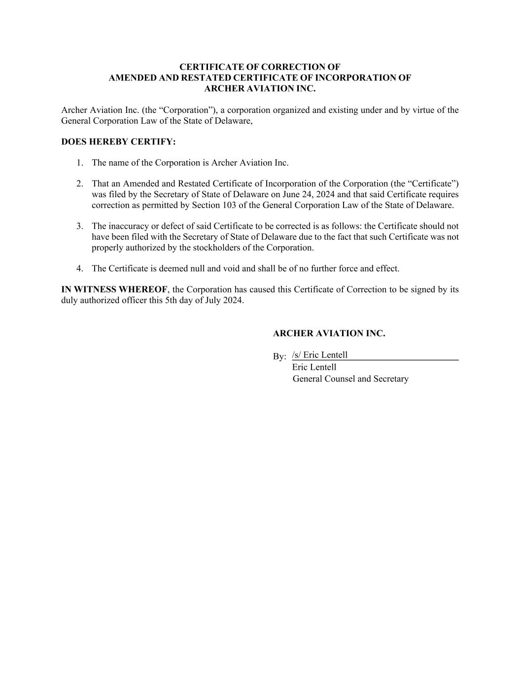 CERTIFICATE OF CORRECTION OF AMENDED AND RESTATED CERTIFICATE OF INCORPORATION OF ARCHER AVIATION INC. Archer Aviation Inc. (the “Corporation”), a corporation organized and existing under and by virtue of the General Corporation Law of the State of Delaware, DOES HEREBY CERTIFY: 1. The name of the Corporation is Archer Aviation Inc. 2. That an Amended and Restated Certificate of Incorporation of the Corporation (the “Certificate”) was filed by the Secretary of State of Delaware on June 24, 2024 and that said Certificate requires correction as permitted by Section 103 of the General Corporation Law of the State of Delaware. 3. The inaccuracy or defect of said Certificate to be corrected is as follows: the Certificate should not have been filed with the Secretary of State of Delaware due to the fact that such Certificate was not properly authorized by the stockholders of the Corporation. 4. The Certificate is deemed null and void and shall be of no further force and effect. IN WITNESS WHEREOF, the Corporation has caused this Certificate of Correction to be signed by its duly authorized officer this 5th day of July 2024. ARCHER AVIATION INC. By: /s/ Eric Lentell Eric Lentell General Counsel and Secretary