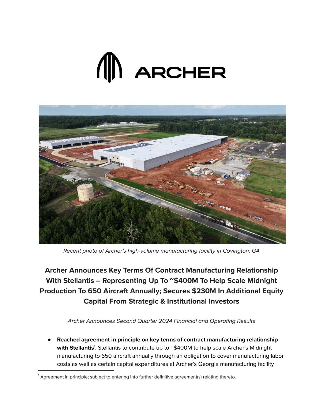 Recent photo of Archer’s high-volume manufacturing facility in Covington, GA Archer Announces Key Terms Of Contract Manufacturing Relationship With Stellantis – Representing Up To ~$400M To Help Scale Midnight Production To 650 Aircraft Annually; Secures $230M In Additional Equity Capital From Strategic & Institutional Investors Archer Announces Second Quarter 2024 Financial and Operating Results ● Reached agreement in principle on key terms of contract manufacturing relationship with Stellantis1. Stellantis to contribute up to ~$400M to help scale Archer’s Midnight manufacturing to 650 aircraft annually through an obligation to cover manufacturing labor costs as well as certain capital expenditures at Archer’s Georgia manufacturing facility 1 Agreement in principle; subject to entering into further definitive agreement(s) relating thereto.